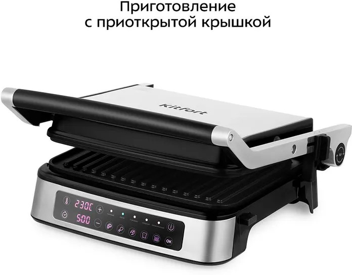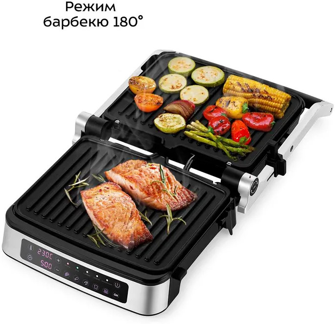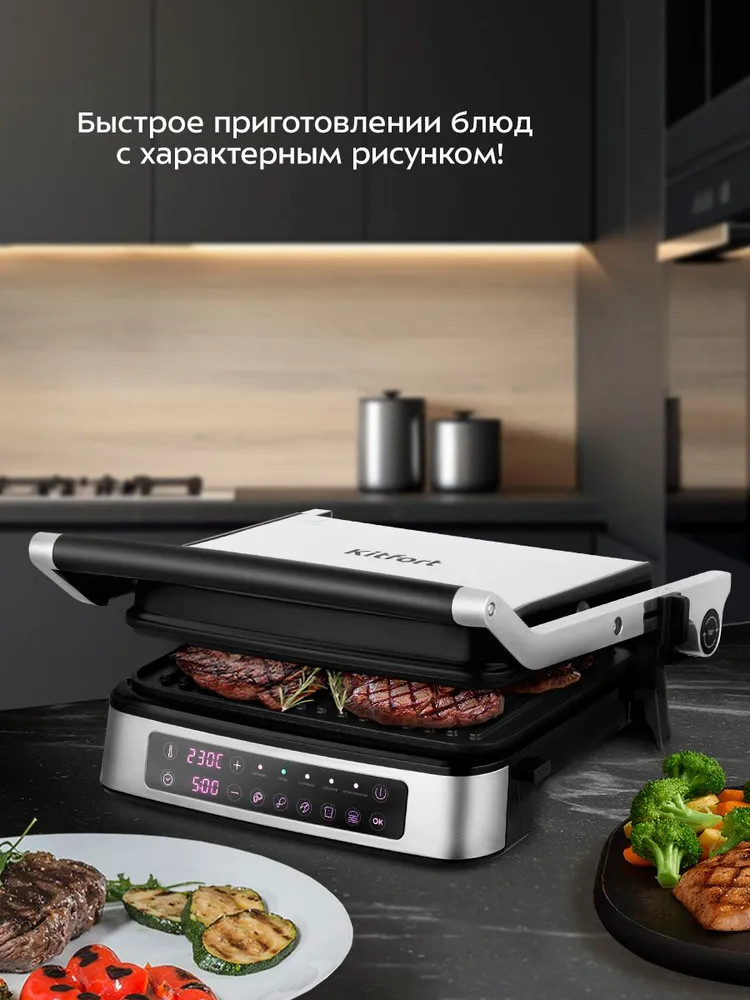 Электрогриль КТ-1687 предназначен для приготовления разнообразных блюд, включая мясо, рыбу, овощи, сосиски, сэндвичи, гренки и тосты! Высокая температура способствует быстрому приготовлению, а ребристая поверхность — появлению «полосатого» рисунка. С помощью панели управления вы можете выбрать автоматический режим работы: мясо, рыба, курица, сосиски, гамбургер и бекон. Вы также можете вручную установить температуру нагрева до 230°C. Кроме того, прибор обладает настройкой степени прожарки.