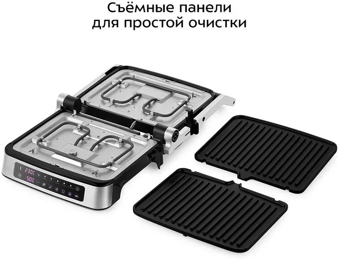 Нагревательные панели съёмные. Что облегчает уход после каждого приготовления. Панели можно снять и вымыть в тёплой воде средством для мытья посуды и мягкой губкой. Панели изготовлены из алюминия с нанесённым антипригарным покрытием. Покрытие, предназначено уменьшить прилипание продуктов к алюминиевым панелям в процессе жарки. Весь лишний жир и сок из блюд попадает в съёмный поддон. Просто выньте поддон и помойте его с моющим средством.