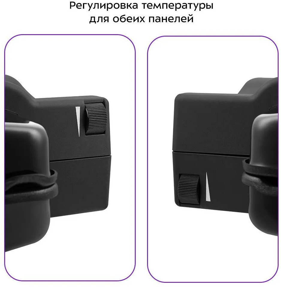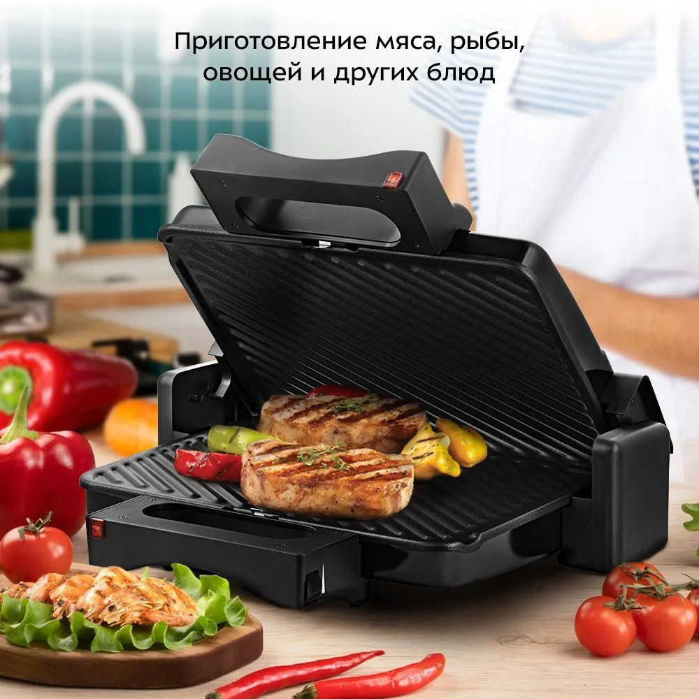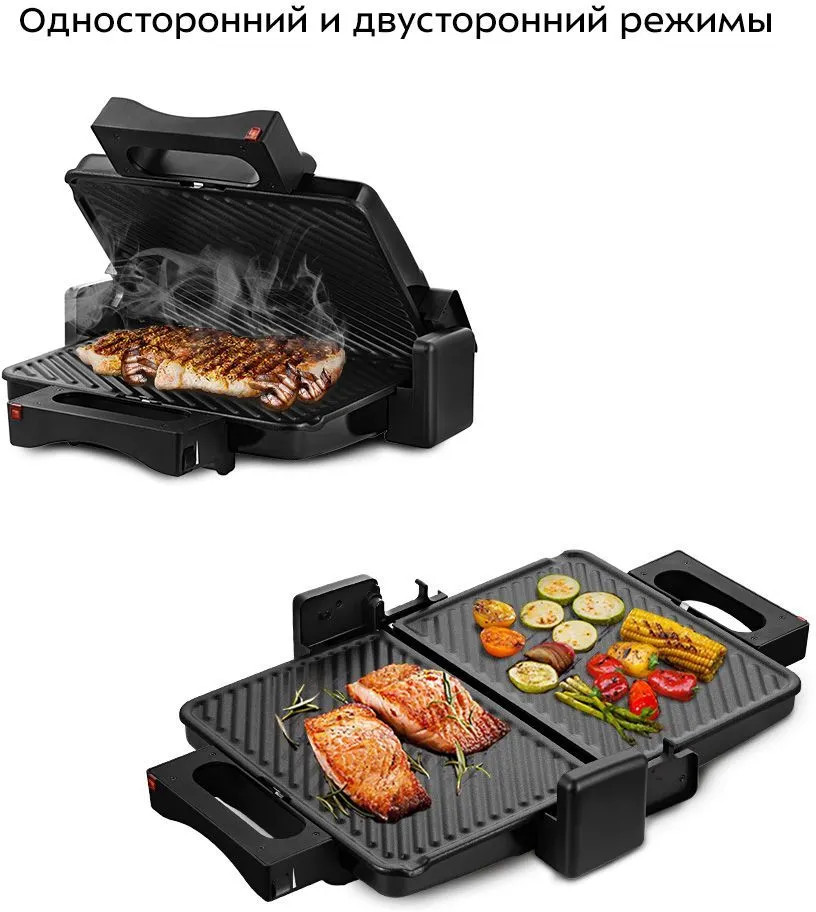 В двустороннем режиме электрогриль закрывается крышкой, что сокращает время готовки, так как продукты готовятся с двух сторон сразу. В одностороннем режиме крышка гриля откидывается на 180°, благодаря чему продукты можно выложить сразу на две панели. На панели нанесено антипригарное покрытие, что позволяет готовить с минимальным количеством масла. Такое покрытие также облегчает процесс чистки панелей. Панели электрогриля съёмные, что упрощает уход за прибором.