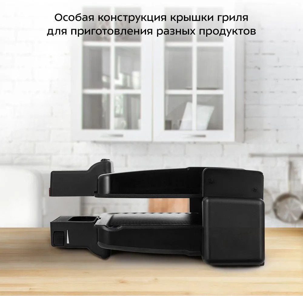 Также из-за особой конструкции крышку гриля можно поднять так, что она будет находиться на расстоянии от нижней панели. Это удобно для приготовления объёмных или хрупких продуктов. Если вы хотите установить крышку так, чтобы между ней и корпусом было пространство, откройте её на 90 градусов, а затем потяните вверх за ручку. Далее опустите крышку так, чтобы выступы рядом с местами крепления крышки попали в фиксаторы крышки.