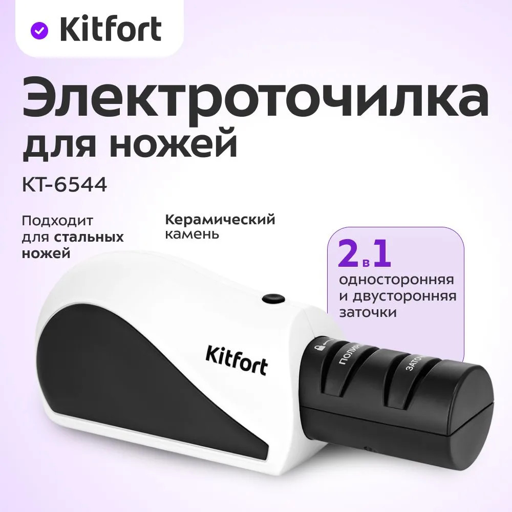 Электроточилка Kitfort KT-6544 подходит для заточки кухонных, спортивных, складных, карманных и других бытовых ножей с гладкими стальными лезвиями. Чтобы ножи служили дольше, заточку точилкой для ножей рекомендуется производить раз в неделю. Абразивные диски неоднородные, различаются по своей зернистости, а именно поверхности и крупности зёрен, входящих в их состав. В данной модели два диска: один для заточки зернистостью в 400 грит и другой для полировки зернистостью 800 грит.