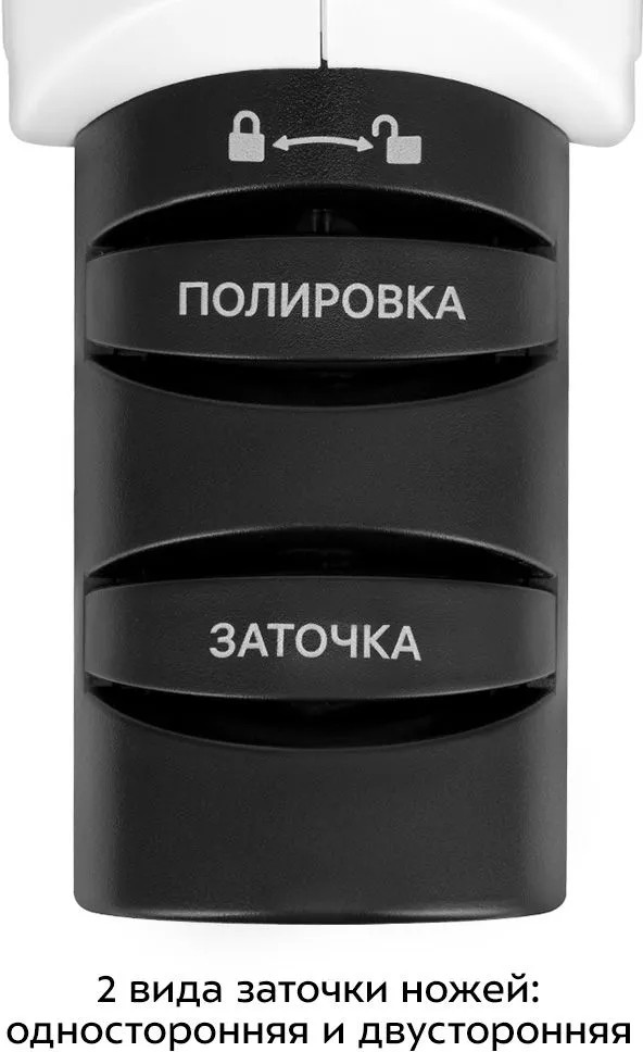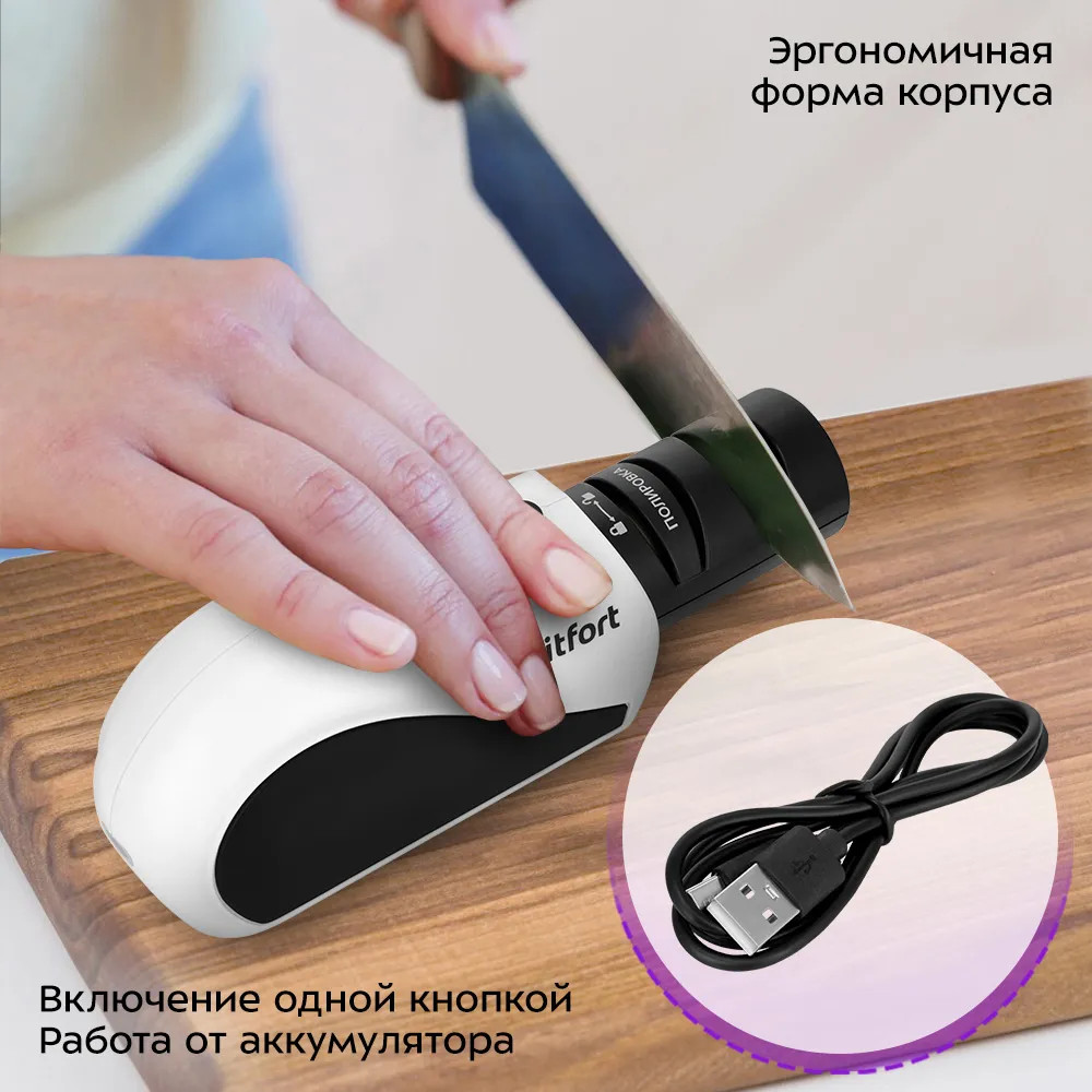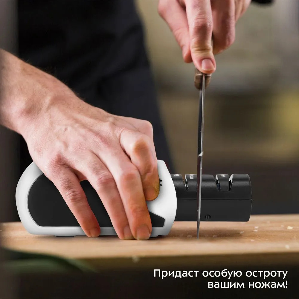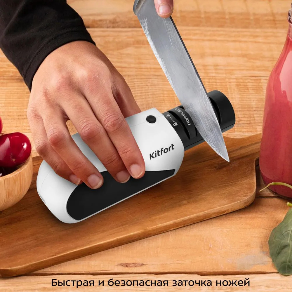 Есть 2 вида заточки ножей: односторонняя и двусторонняя. Ножи с односторонней заточкой обычно немного острее. Большинство кухонных ножей имеют двустороннюю заточку, так как их лезвие позволяет не только резать, но и рубить и распарывать продукты. Благодаря эргономичной форме корпуса электроточилки для ножей КТ-6544 вам будет удобно придерживать прибор во время работы. Управление прибором осуществляется с помощью нажатия одной кнопки. Устройство работает от аккумулятора.