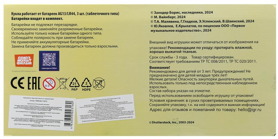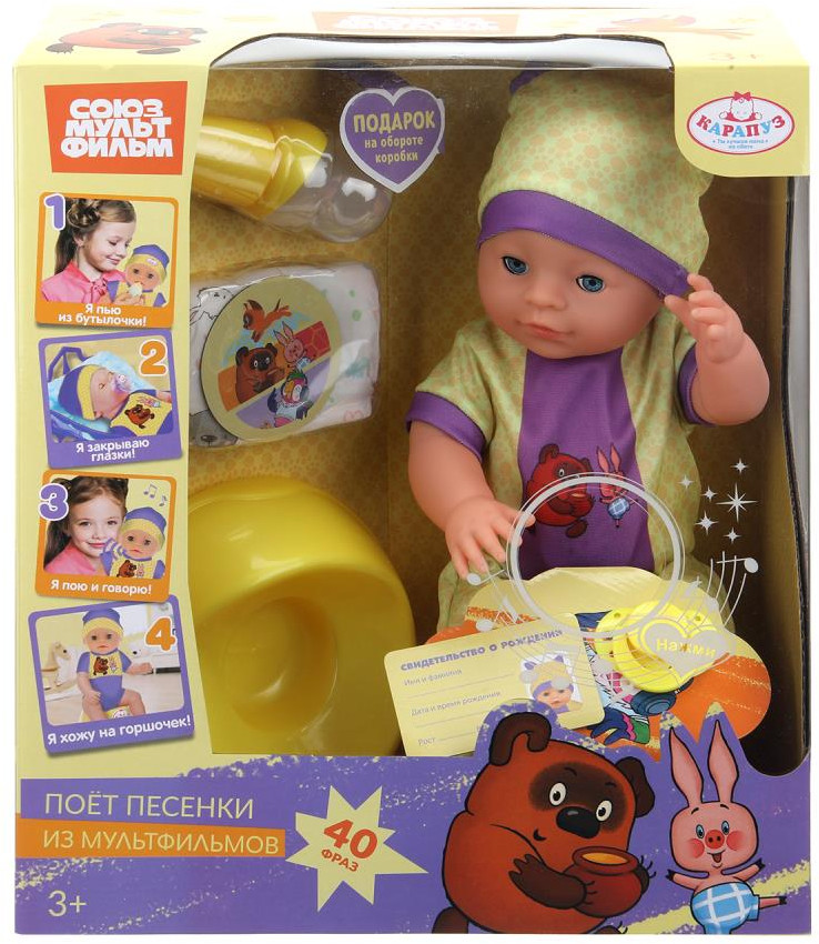 💳 Оплатить за товар можно при получении 🇰🇿 Есть бесплатная доставка по Казахстану от 1 дня 🎁 Копите бонусы с каждой покупки Серия: Союзмультфильм Интерактивный пупс «Союзмультфильм» ТМ «Карапуз» станет прекрасным подарком для вашего ребёнка. Этот милый пупс, с детально проработанным личиком, обязательно понравится малышке. Кукла одета в симпатичный желтый с фиолетовым костюмчик с принтом в виде персонажей м/ф. На голове у куколки — шапочка в тон. Одежда легко снимается и надевается. Для более интересной игры в комплекте с пупсом идут разнообразные аксессуары. |