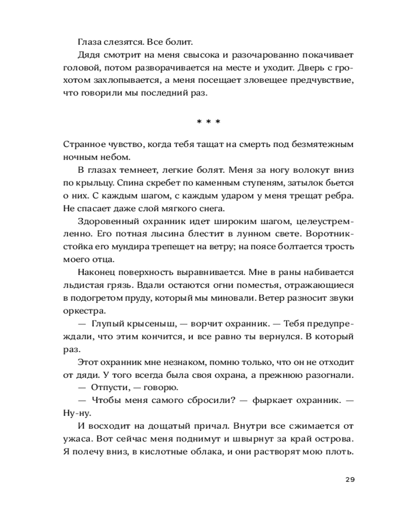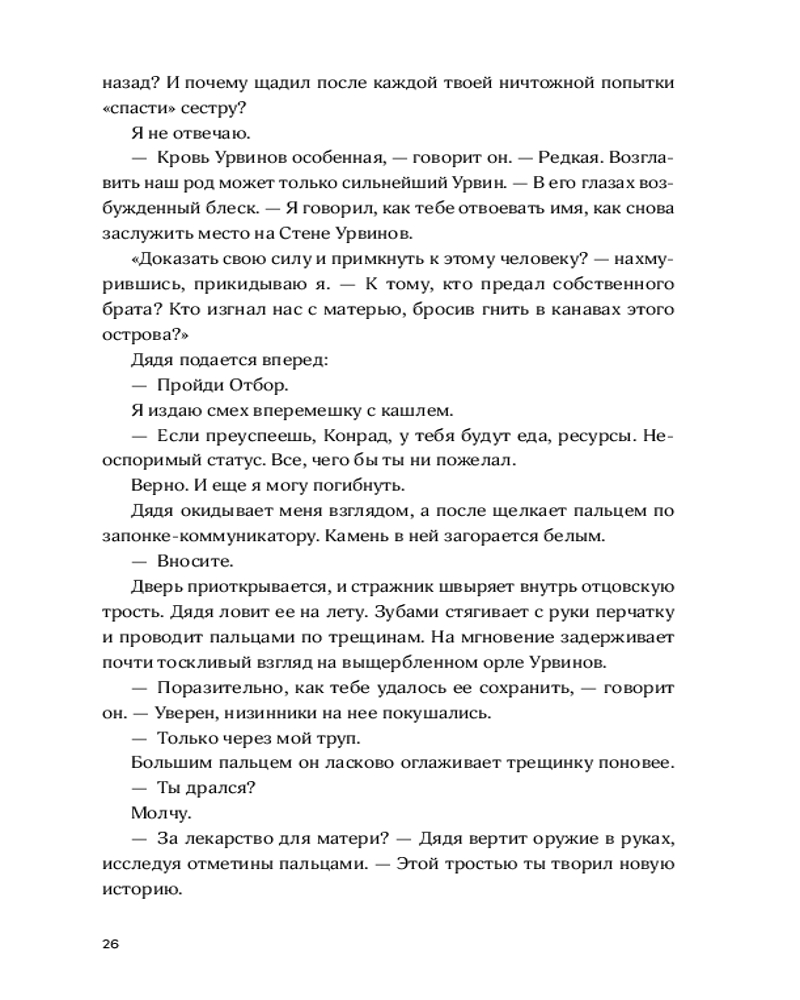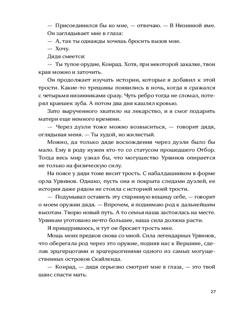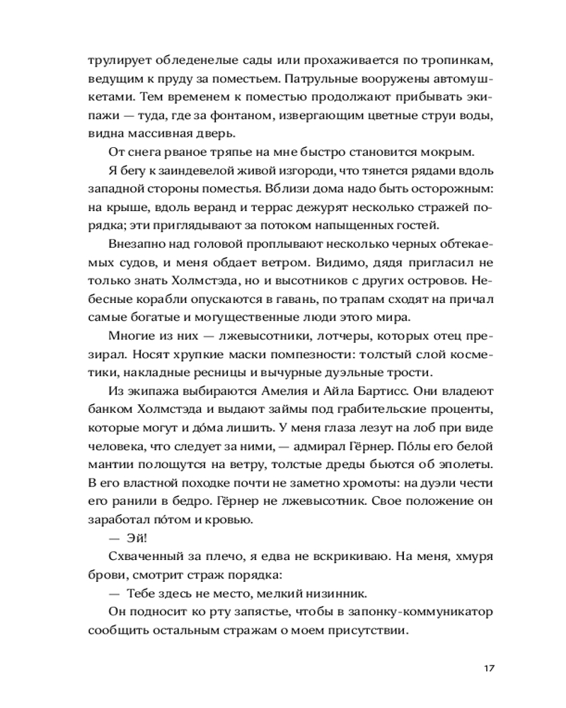 💳 Оплатить за товар можно при получении 🇰🇿 Есть бесплатная доставка по Казахстану от 1 дня 🎁 Копите бонусы с каждой покупки Острова Скайленда парят над ядовитыми черными облаками, и страшнее всего — оказаться внизу, у края бездны. Там никто не защитит от гигантских металлических змеев, способных за раз уничтожить целый район. Шестнадцатилетний Конрад мечтает отомстить дяде, захватившему родовое поместье на вершине острова. Но, изгнанный в Низину, Конрад вынужден заключить с дядей сделку ради своей сестры, которую тот оставил себе на воспитание. Он проходит отбор в цех Охоты, где его ждут суровые тренировки, интриги соперников и смертельно опасное Состязание. |