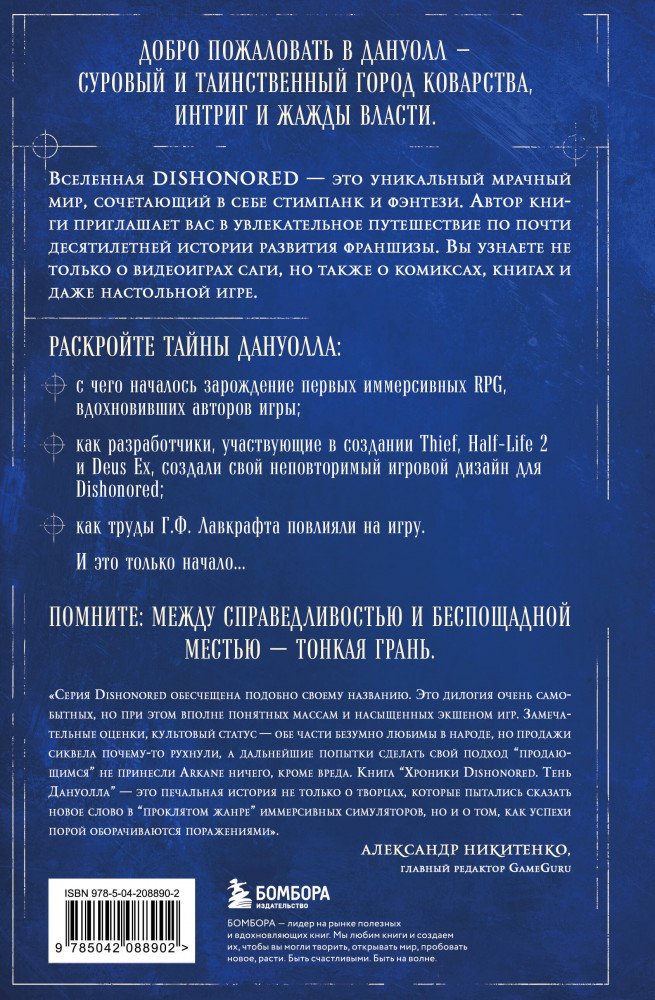 Серия: Легендарные компьютерные игры Вселенная Dishonored — это уникальный мрачный мир, сочетающий в себе стимпанк и фэнтези. Автор книги приглашает вас в увлекательное путешествие по почти десятилетней истории развития франшизы. Вы узнаете не только о видеоиграх саги, но также о комиксах, книгах и даже настольной игре. |