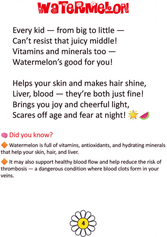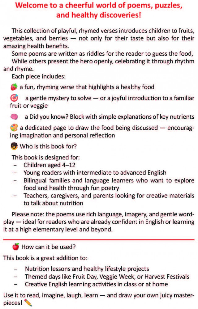 «Fruits, Veggies and Berries in Rhyme» is a cheerful collection of poems about healthy foods — some written as playful riddles, others as joyful tributes. Each piece features fun rhymes, a short educational note, and a page for children to draw the featured fruit, veggie, or berry. |