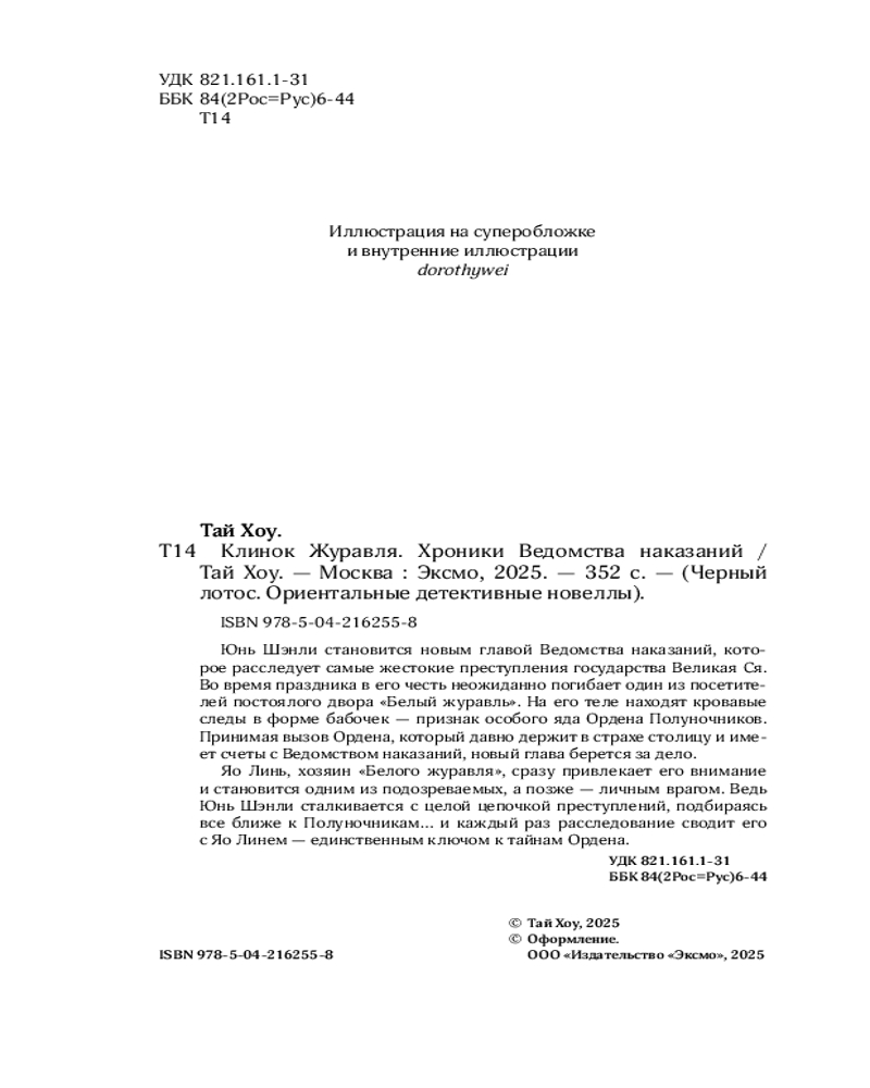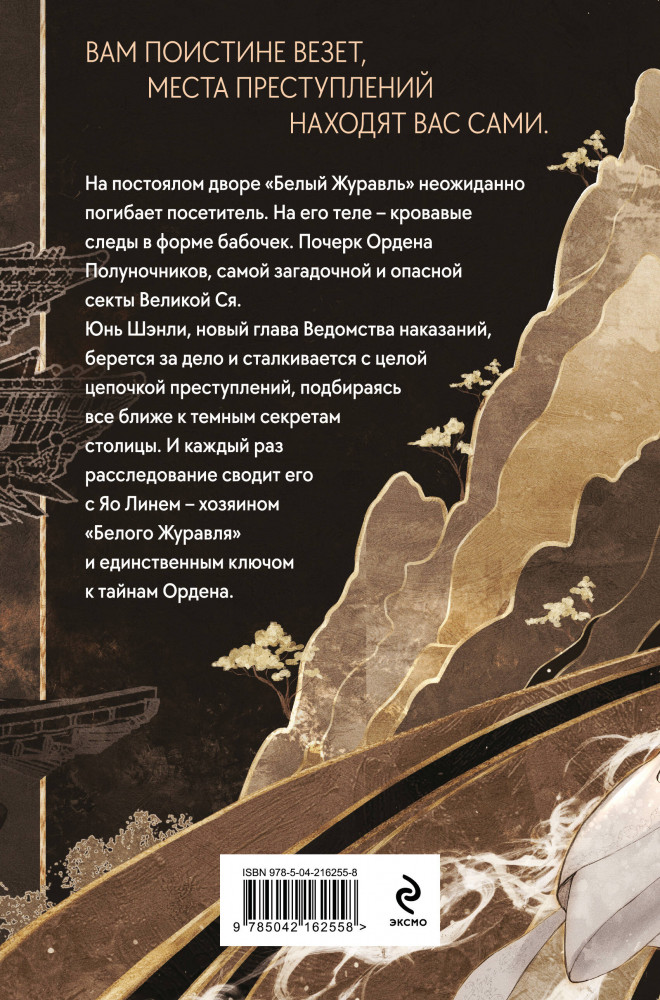 💳 Оплатить за товар можно при получении 🇰🇿 Есть бесплатная доставка по Казахстану от 1 дня 🎁 Копите бонусы с каждой покупки Серия: Черный лотос. Ориентальные детективные новеллы Юнь Шэнли становится новым главой Ведомства наказаний, которое расследует самые жестокие преступления государства Великая Ся. Во время праздника в его честь неожиданно погибает один из посетителей постоялого двора «Белый журавль». На его теле находят кровавые следы в форме бабочек — признак особого яда Ордена Полуночников. Принимая вызов Ордена, который давно держит в страхе столицу и имеет счеты с Ведомством наказаний, новый глава берется за дело. Яо Линь, хозяин «Белого журавля», сразу привлекает его внимание и становится одним из подозреваемых, а позже — личным врагом. Ведь Юнь Шэнли сталкивается с целой цепочкой преступлений, подбираясь все ближе к Полуночникам... и каждый раз расследование сводит его с Яо Линем — единственным ключом к тайнам Ордена. |