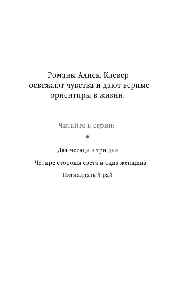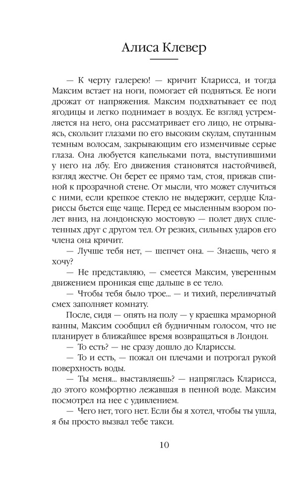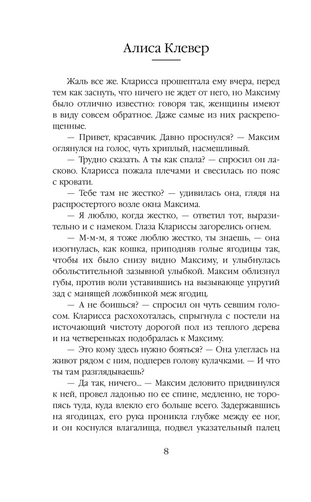 | Алиса Клевер — российский писатель, автор трилогии «Два месяца и три дня» — русского ответа «50 оттенкам серого». Алиса Клевер — это псевдоним, за которым скрывается популярный автор, книги которого читает вся страна. По словам писателя, откровенная чувственная трилогия — это смелый эксперимент. «Для писателей табу всегда становится вызовом. Так что работа над трилогией стала для меня своего рода попыткой заглянуть внутрь неуправляемой стихии, урагана — и описать все так, как вижу я», —... |