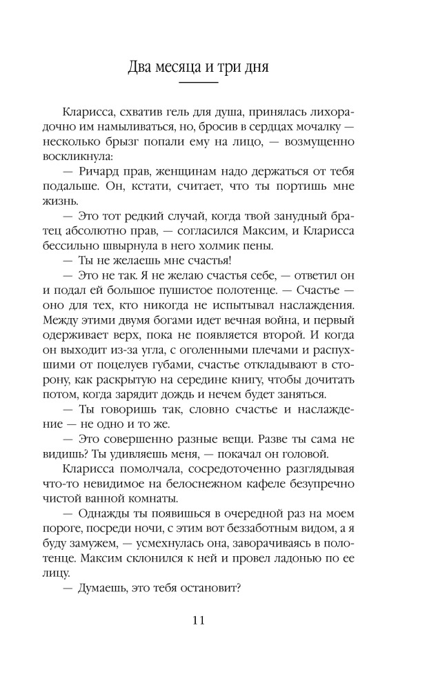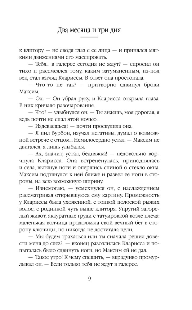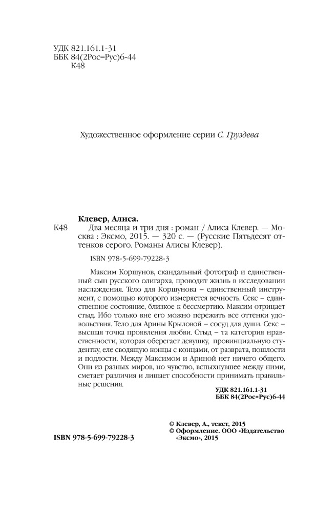 Два месяца и три дняВ данный момент этот товар отсутствует в продаже. Возможно, у нас найдется аналогичный или похожий товар здесь. Серия: Русская Эрика Джеймс. Романы Алисы Клевер "Мне в жизни дали слишком много того, о чем я не просил…." Максим Коршунов, скандальный фотограф и единственный сын русского олигарха, проводит жизнь в исследовании наслаждения. Тело для Коршунова - единственный инструмент, с помощью которого измеряется вечность. Секс - единственное состояние, близкое к бессмертию. Максим отрицает стыд. Ибо только вне его можно пережить все оттенки удовольствия. Тело для Арины - сосуд для души. Секс - высшая точка проявления любви. Стыд - та категория нравственности, которая оберегает девушку, провинциальную студентку, еле сводящую концы с концами, от разврата, пошлости и подлости. Между Максимом и Ариной нет ничего общего. Они из разных миров, но чувство, вспыхнувшее между ними, сметает различия и лишает способности принимать правильные решения.«Два месяца и три дня» – российский ответ абсолютному бестселлеру «50 оттенков серого»! |