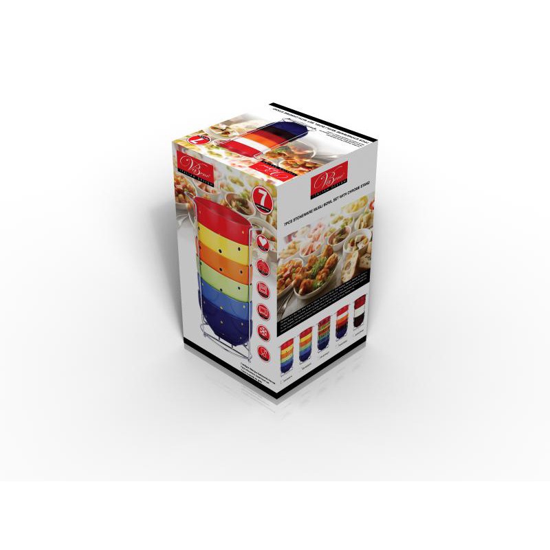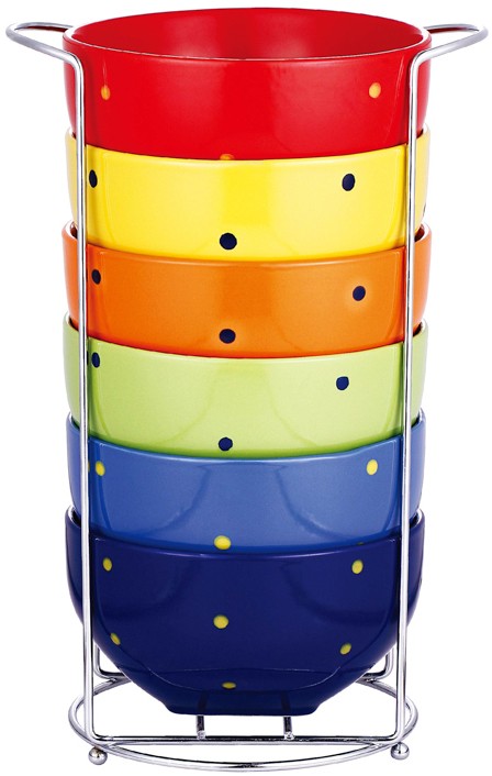 В составе набора 6 пиал, объемом 550 мл и элегантная хромированная подставка для сушки и хранения посуды.