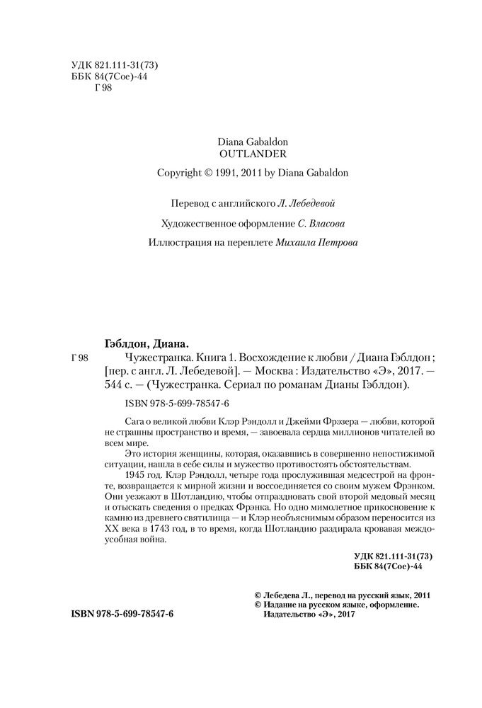 Чужестранка. Книга 1. Восхождение к любвиВ данный момент этот товар отсутствует в продаже. Возможно, у нас найдется аналогичный или похожий товар здесь. Сага о великой любви Клэр Рэндолл и Джейми Фрэзера - любви, которой не страшны пространство и время, — завоевала сердца миллионов читателей во всем мире. Это история женщины, которая, оказавшись в совершенно непостижимой ситуации, нашла в себе силы и мужество противостоять обстоятельствам. 1945 год. Клэр Рэндолл, четыре года прослужившая медсестрой на фронте, возвращается к мирной жизни и воссоединяется со своим мужем Фрэнком. Они уезжают в Шотландию, чтобы отпраздновать свой второй медовый месяц и отыскать сведения о предках Фрэнка. Но одно мимолетное прикосновение к камню из древнего святилища - и Клэр необъяснимым образом переносится из XX века в 1743 год, в то время, когда Шотландию раздирала кровавая междоусобная война. |
