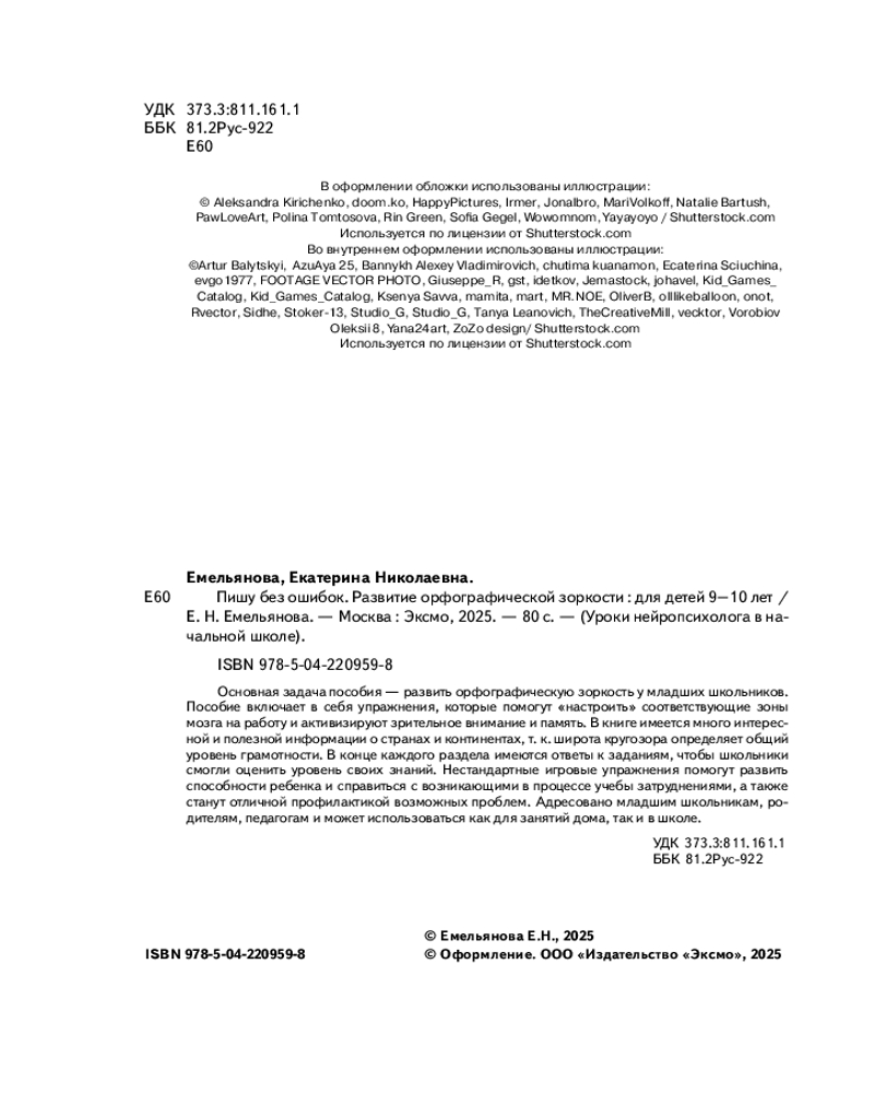 💳 Оплатить за товар можно при получении 🇰🇿 Есть бесплатная доставка по Казахстану от 1 дня 🎁 Копите бонусы с каждой покупки Серия: Уроки нейропсихолога в начальной школе Основная задача пособия — развить орфографическую зоркость у младших школьников. Пособие включает в себя упражнения, которые помогут «настроить» соответствующие зоны мозга на работу и активизируют зрительное внимание и памячть. В книге имеется много интересной и полезной информации о странах и континентах, т. к. широта кругозора определяет общий уровень грамотности. В конце каждого раздела имеются ответы к заданиям, чтобы школьники смогли оценить уровень своих знаний. Нестандартные игровые упражнения помогут развить способности ребенка и справиться с возникающими в процессе учебы затруднениями, а также станут отличной профилактикой возможных проблем. Адресовано младшим школьникам, родителям, педагогам и может использоваться, как для занятий дома, так и в школе. |