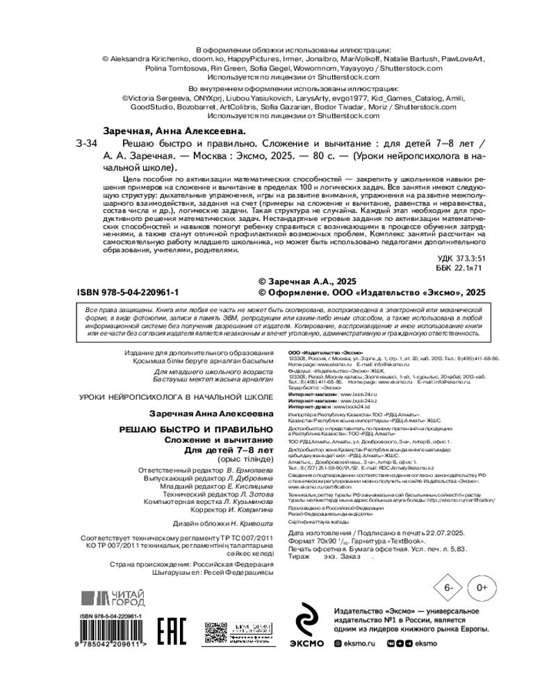 💳 Оплатить за товар можно при получении 🇰🇿 Есть бесплатная доставка по Казахстану от 1 дня 🎁 Копите бонусы с каждой покупки Серия: Уроки нейропсихолога в начальной школе Пособие по активизации математических способностей подготовлено практикующим нейропсихологом, преподавателем НИЦ Детской нейропсихологии имени А. Р. Лурия, который каждый день помогает учащимся начальной школы справиться с возникающими проблемами в обучении. Цель книги — формирование и закрепление у детей навыков счёта, приёмов сложения и вычитания в пределах 100, приобретения опыта решения логических задач. В каждом занятии, кроме примеров на сложение и вычитание, неравенств и равенств, заданий на состав числа и составление последовательностей, решения логических задач, даются ещё и дыхательные упражнения, игры на развитие внимания и межполушарного взаимодействия, что позволит быстро и качественно обрабатывать поступающую информацию. Вопросы и задания в разделах выстроены в определенном порядке, который помогает активизировать механизмы соответствующих отделов мозга. |