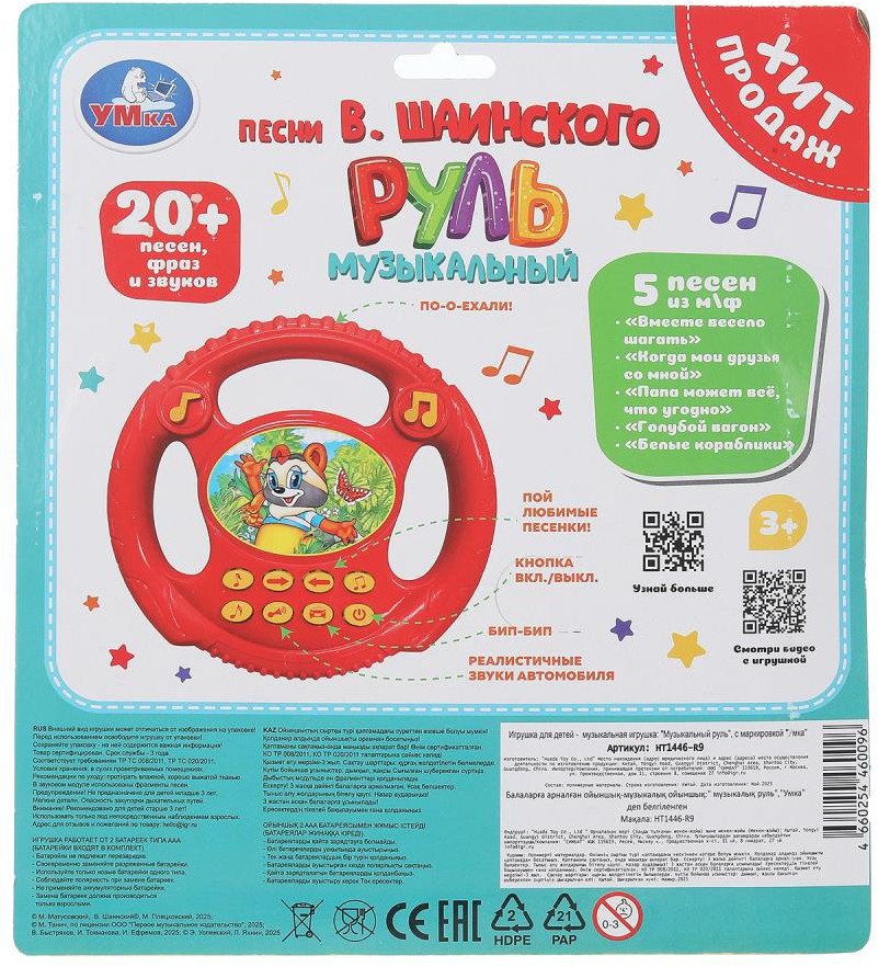 💳 Оплатить за товар можно при получении 🇰🇿 Есть бесплатная доставка по Казахстану от 1 дня 🎁 Копите бонусы с каждой покупки Музыкальный руль с песнями В. Шаинского ТМ «УМка» обязательно понравится маленькому гонщику. Игрушка выполнена в виде яркого руля с кнопками, активирующими звуковое сопровождение. С таким рулем ребёнок сможет придумать массу игровых сюжетов, представляя себя в роли водителя. |