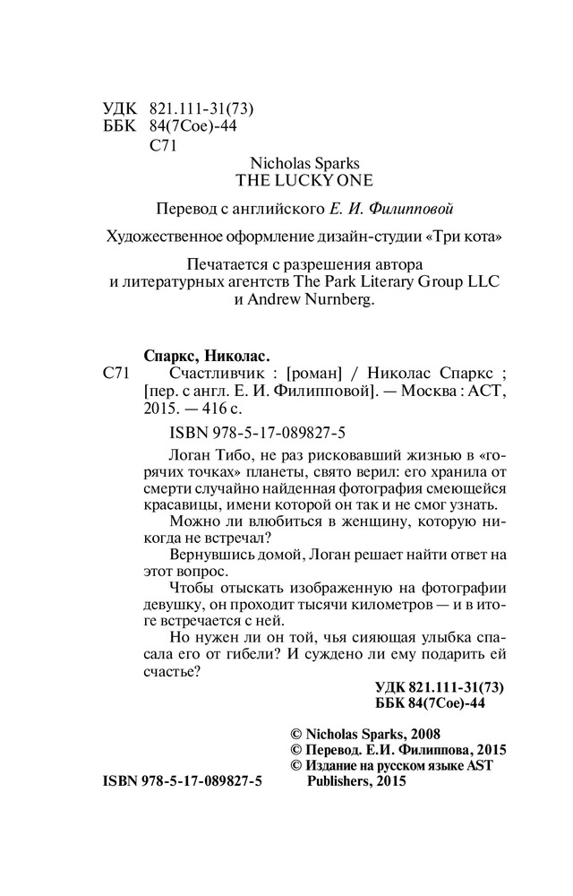 Прочитал книгу с удовольствием, читается очень легко, сразу как прочел посмотрел фильм Счастливчик 2011 года, сравнил фильм и книгу, в фильме много вырезанных сцен, но главное сюжет присутствует, в общем и книга и фильм очень понравился, P.s Спасибо флип за доставку!