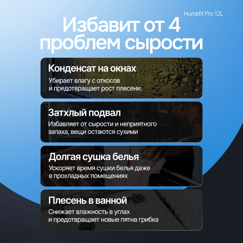 Что умеет: устраняет сырость, конденсат и затхлый запах после дождей, протечек и в межсезонье. Помогает в ванной, на первом этаже/в угловых комнатах, в подвале и гараже. Поддерживает сухость в квартире и доме, на даче, в офисе, салоне, небольшом зале ожидания.