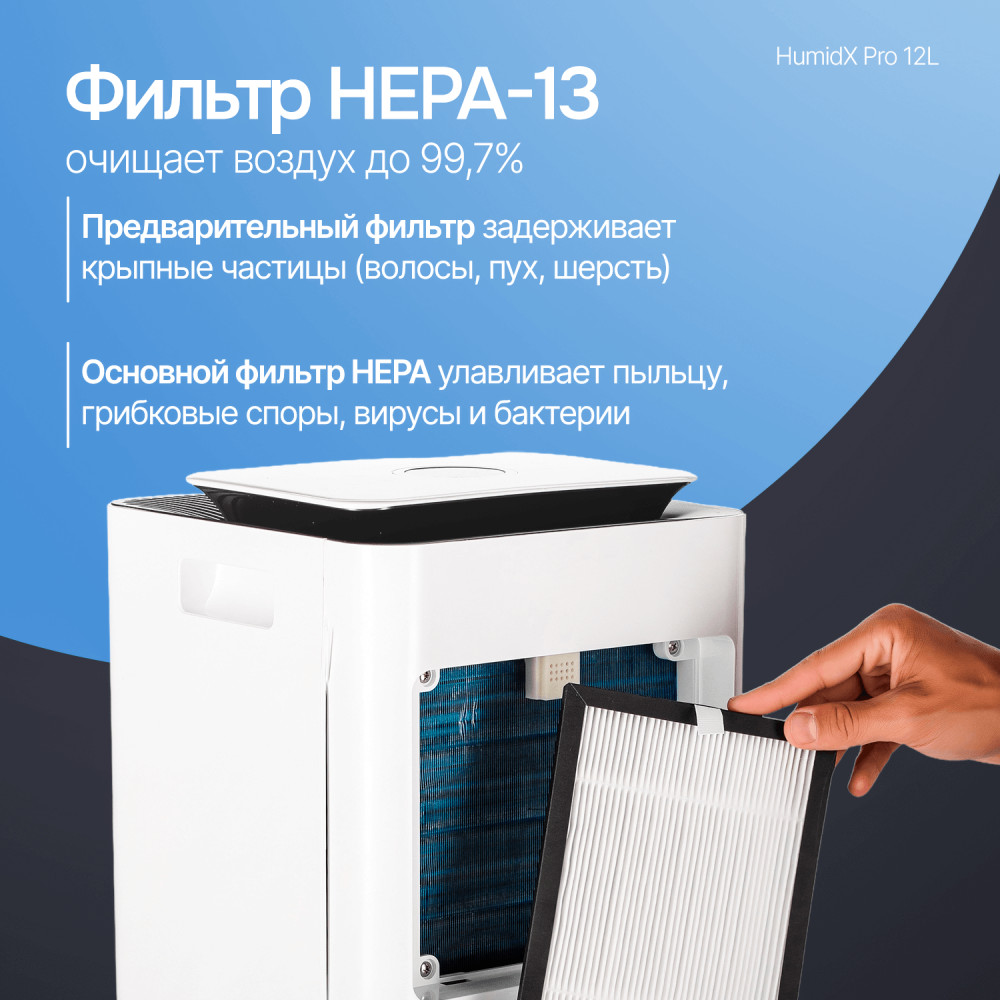 Комплектация: осушитель HumidX Pro 12L; съёмный бак 2,0 л; фильтр 3-в-1 (предфильтр/HEPA/угольный); руководство пользователя. На корпусе есть порт дренажа для шланга.
