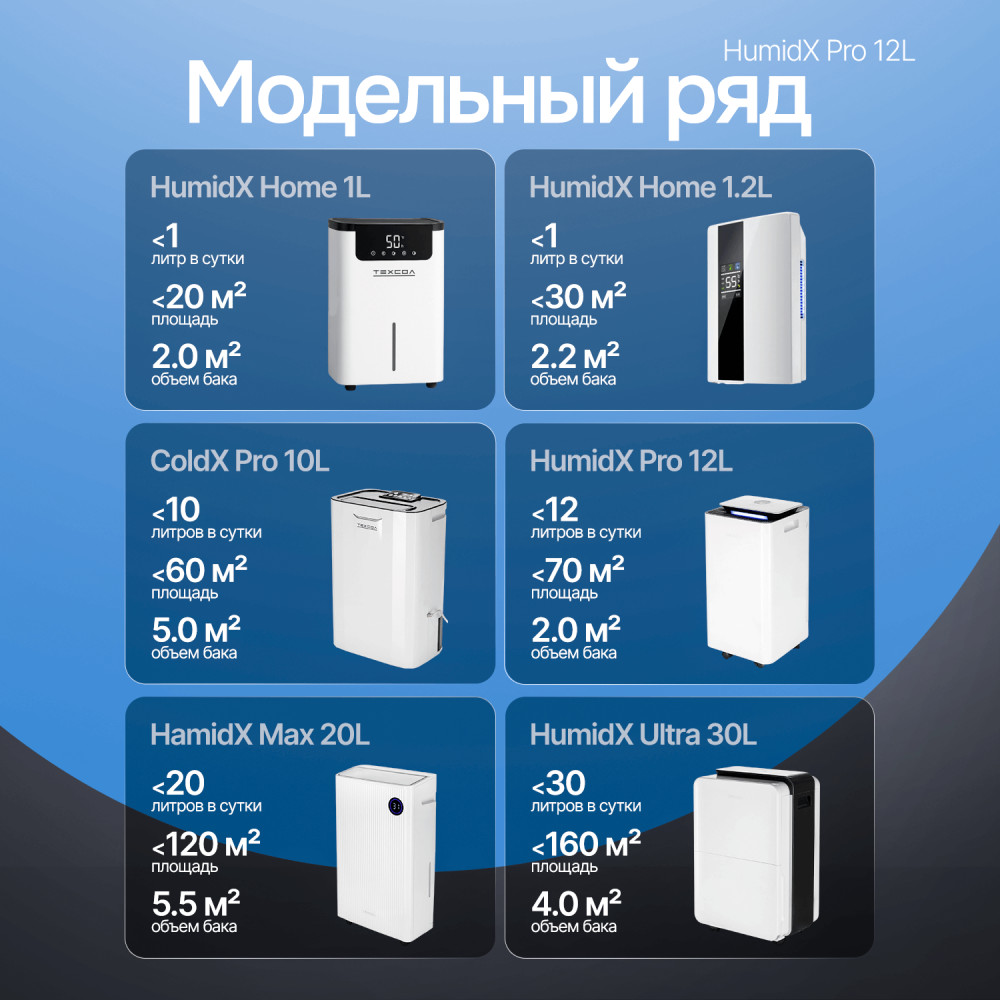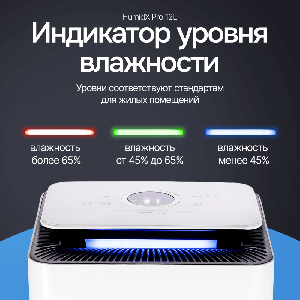 TЕXSOL HumidX Pro 12L 12 л/тәул. дейін, 20–80 м², иондау, HEPA-сүзгі, 24 сағ таймер, дренаж (ақ). TЕXSOL HumidX Pro 12L артық ылғалды тез азайтып, терезедегі конденсат пен көк иісті жояды. Гигростат ылғалдылықты 30–80 % деңгейінде ұстайды, кір кептіру және түнгі режим бар. Өнімділігі тәулігіне 12 л, аумақ 20–80 м², дыбысы тыныш — ≈36 дБ.