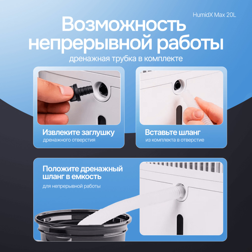 • как быстрее добиться результата? Закройте окна/двери в комнате, поставьте прибор ближе к центру, включите «Непрерывный режим» или «Сушку белья». Для долгой работы подключите дренаж;