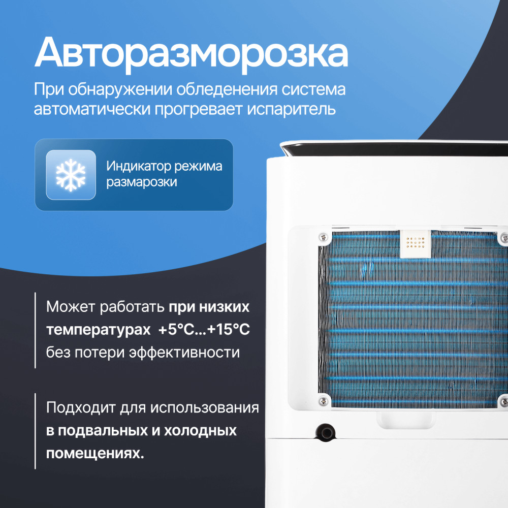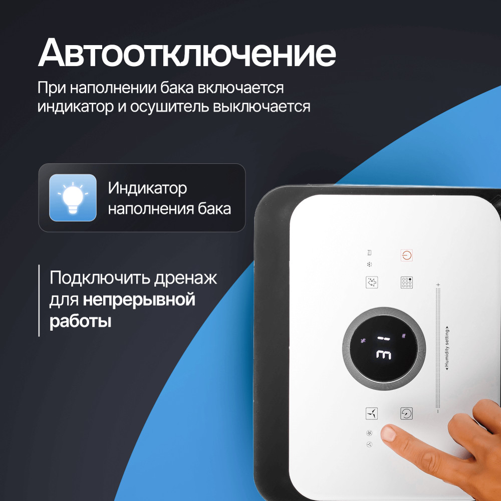 • режимы под задачу: непрерывное осушение для сложных случаев, «сушка белья» ускоряет высыхание одежды, ночной режим снижает шум и отключает подсветку;
