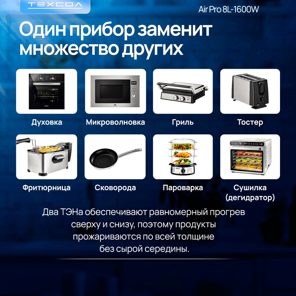 ТЕХСОЛ Air Pro — күнделікті қолдануға арналған әмбебап аэрогриль. Бір адамға, жұпқа немесе бүкіл отбасыға арналған порцияларды тез әрі біркелкі дайындайды. 8,5 л тостаған мерекеге жеткілікті қор береді, ал жұмыс күндері отбасыға ыңғайлы порциялар пісіруге мүмкіндік береді. Қос қыздырғыш (2 ТЭН), 12 бағдарлама және мөлдір терезе артық май қоспай-ақ процесті толық бақылауға мүмкіндік береді.