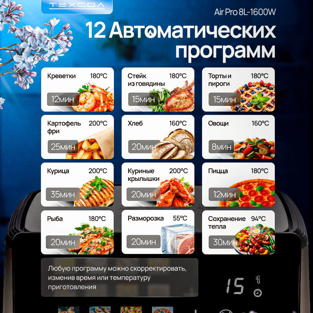 • 12 программ: картофель фри, ножки, стейк, креветки, десерт, овощи, курица, крылья, сушка, рыба, выпечка, разморозка;