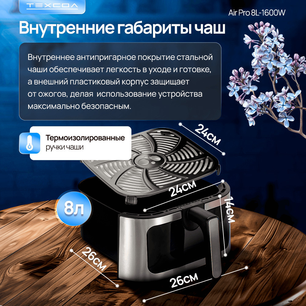• объём 8,5 л: подходит для семьи (целая курица, стейки, гарниры); внутр. размеры чаши 24×24 см;