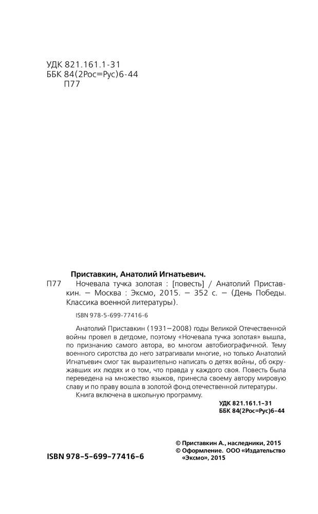 В данный момент этот товар отсутствует в продаже. Возможно, у нас найдется аналогичный или похожий товар здесь. Серия: День Победы Анатолий Приставкин (1931-2008) годы Великой Отечественной войны провел в детдоме, поэтому «Ночевала тучка золотая» вышла, по признанию самого автора, во многом автобиографичной. Тему военного сиротства до него затрагивали многие, но только Анатолий Игоревич смог так выразительно написать о детях войны, об окружавших их людях и о том, что правда у каждого своя. Повесть была переведена на множество языков, принесла своему автору мировую славу и по праву вошла в золотой фонд отечественной литературы.