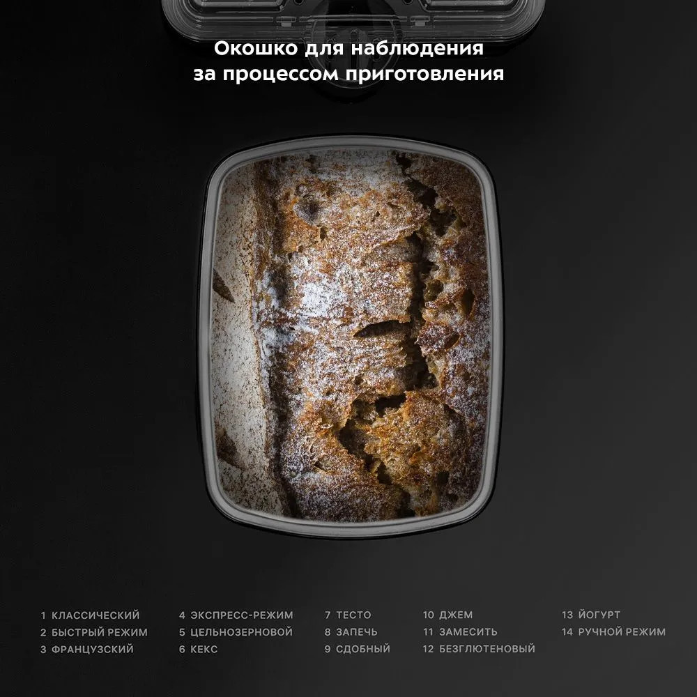 Корпус хлебопечки выполнен из пластика и нержавеющих элементов. В верхней крышке есть прозрачное окошко, через которое увлекательно наблюдать за процессом приготовления домашней выпечки или десерта! Функция поддержания температуры готовых блюд сохраняет выпечку свежей и горячей в течение одного часа после завершения работы. При отключении электропитания во время работы настройки приготовления сохраняются в памяти прибора на 10 минут.