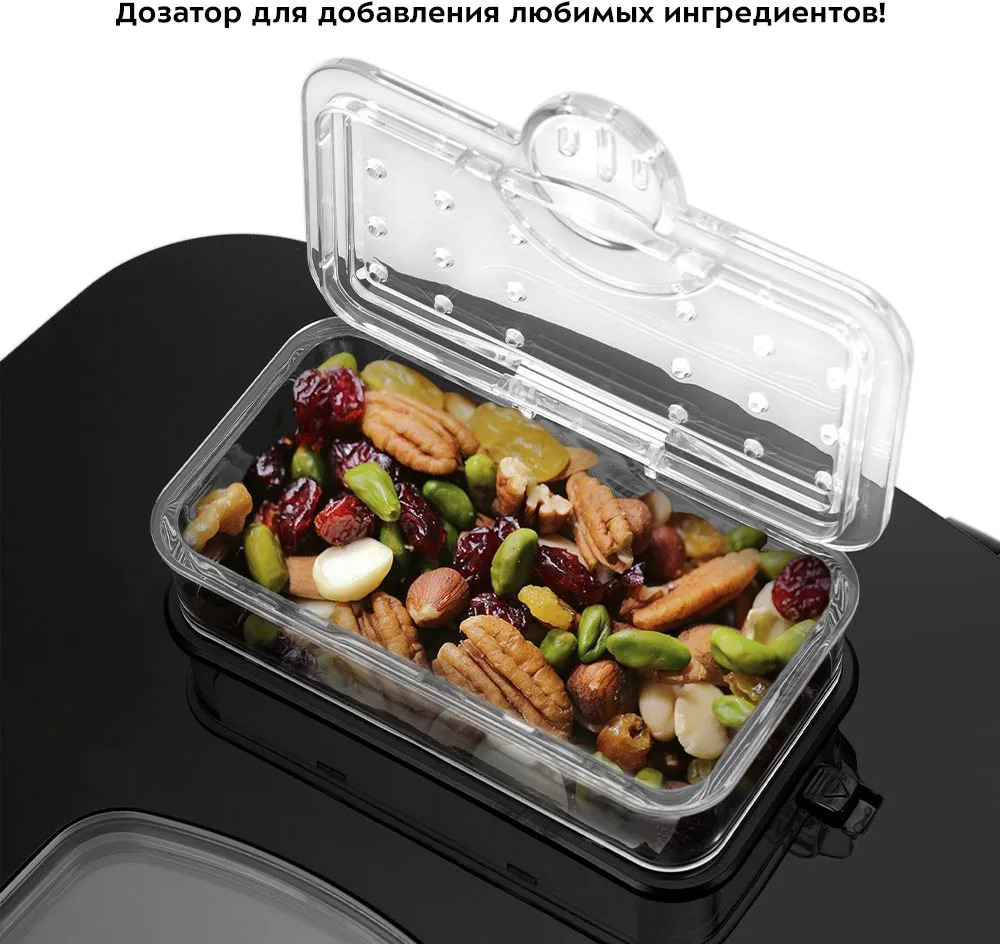 В крышку установлен автоматический дозатор для добавления в выпечку дополнительных ингредиентов во время приготовления без вашего участия! Кунжут, орехи, зелень, изюм, цукаты — всё и даже больше на ваш вкус. Форму для выпечки, мерную ложку и стакан, крюк и лопатку мойте горячей водой с использованием мягкого средства для мытья посуды. Форма и лопатка имеют антипригарное покрытие, поэтому не используйте металлические предметы и агрессивные моющие средства.