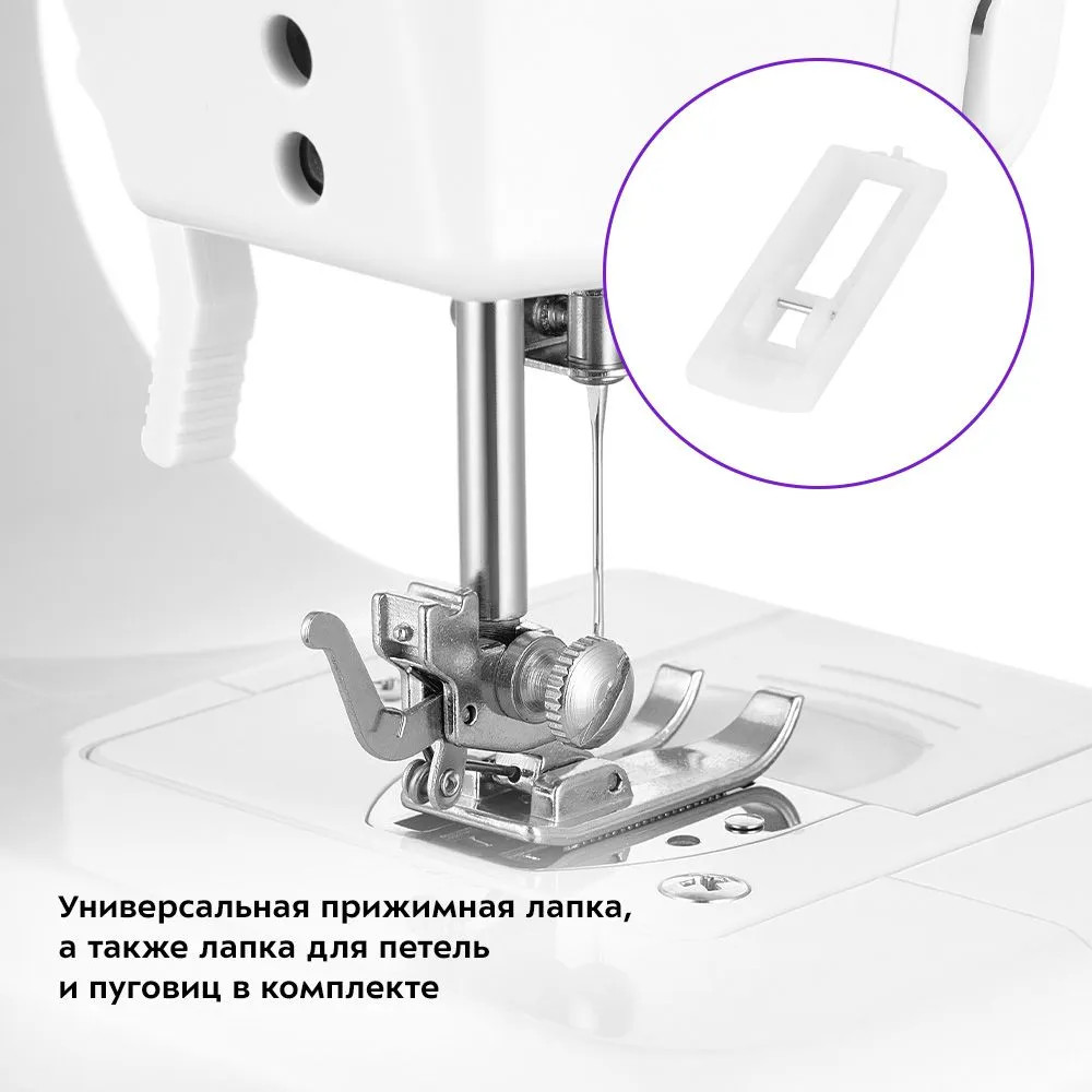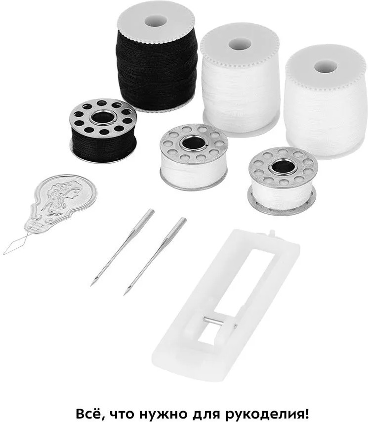 В комплекте идут 3 иглы, 3 шпульки с ниткой, 3 катушки с ниткой, лапка для петель, нитевдеватель, ножная педаль, универсальная прижимная лапка и другие детали. Полный комплект для вашего творчества! В выдвижном отсеке для аксессуаров удобно хранить дополнительные лапки, иглы и другие мелкие принадлежности. Также на корпусе устройства есть небольшая ручка для переноски.