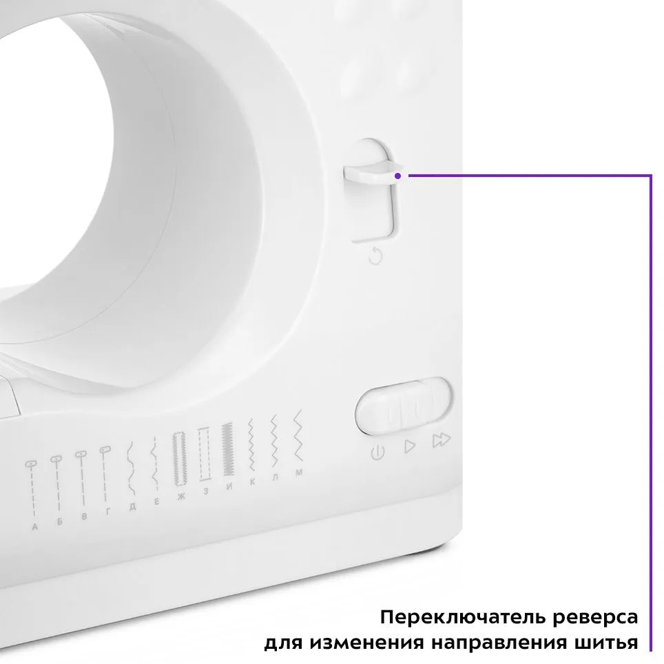 Регулятор позволяет настроить правильное натяжение верхней нити для каждого типа ткани. Степени натяжения нити отмечены цифрами от 1 до 9: чем меньше цифра, тем меньше натяжение. Стандартным для большинства являются 3, 4 и 5. Нажатие на переключатель реверса запускает шитье в обратном направлении. Эта функция обычно используется для закрепления нити в начале и в конце строчки. Устройство будет шить в обратном направлении, пока вы удерживаете переключатель.