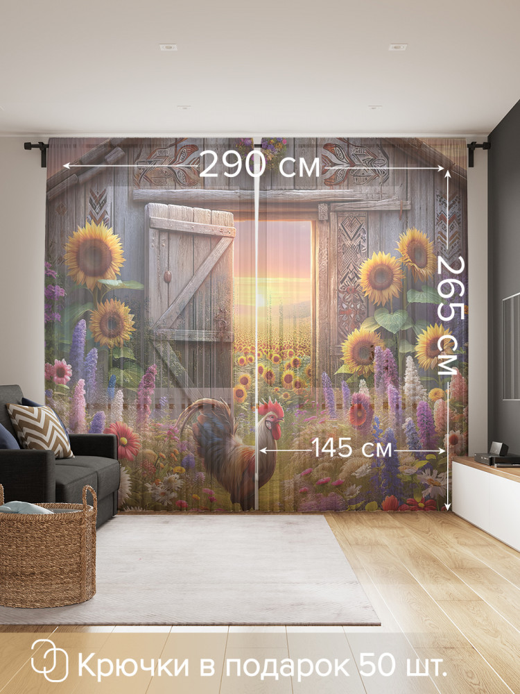 Занавеска длинная на шторной ленте 6 см. уже готова к использованию, ее можно повесить на крючки (в комплекте 50 крючков), карниз для штор, гардину или трубу. Тюль-сеточка с фотопринтом отлично подходит для кухни и комнаты. Края имеют ровный срез, не осыпаются в процессе эксплуатации и не требуют дополнительной обработки. Вуаль подходит для дачи, спальни, балкона, кабинета и детской комнаты, отлично рассеивает и пропускает небольшое количество дневного света около 80%. Яркость рисунка может отличаться от изображения на сайте. Допустимо отклонение в размерах ± 5 см.