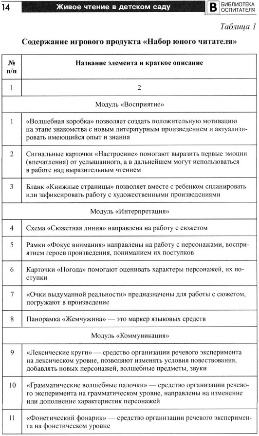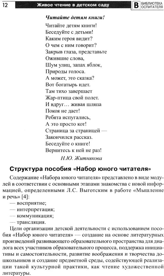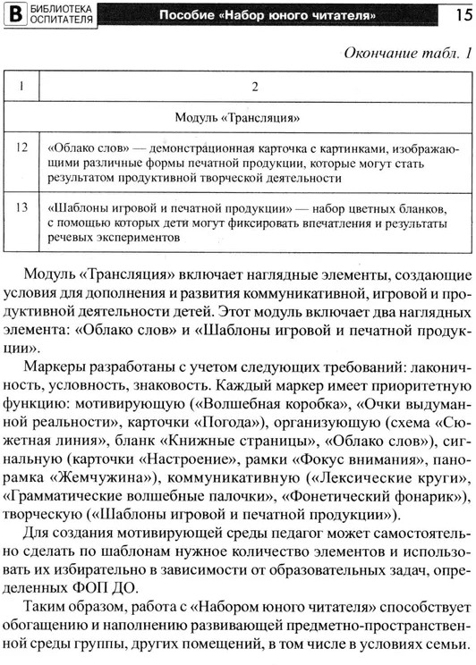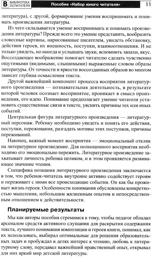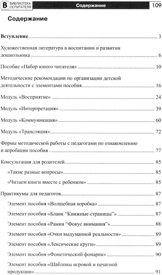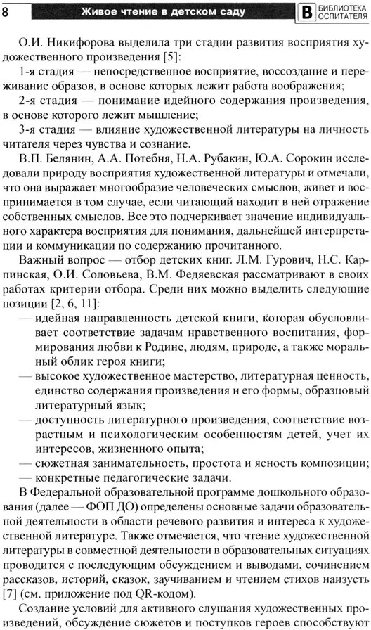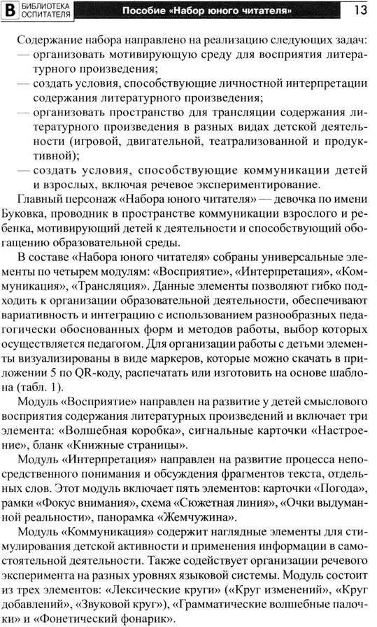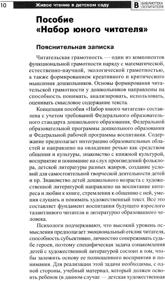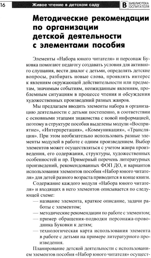 Серия: Библиотека воспитателя Книга представляет собой методическое пособие, содержащее рекомендации и практические разработки, направленные на приобщение детей к художественной литературе с использованием авторского материала «Набор юного читателя». Концепция данного набора разработана в соответствии с целями и задачами Федеральных государственных образовательных стандартов дошкольного образования (ФГОС ДО) и Федеральной образовательной программы дошкольного образования (ФОП ДО). Основное внимание в пособии уделяется знакомству детей с литературными произведениями различных жанров и приобщению их к книжной культуре. Это достигается через организацию детской деятельности, включающей активное слушание, обсуждение и трансляцию впечатлений от прочитанного. Такой подход создает прочную основу для развития навыков смыслового чтения, что является важным этапом в подготовке детей к обучению в начальной школе. |