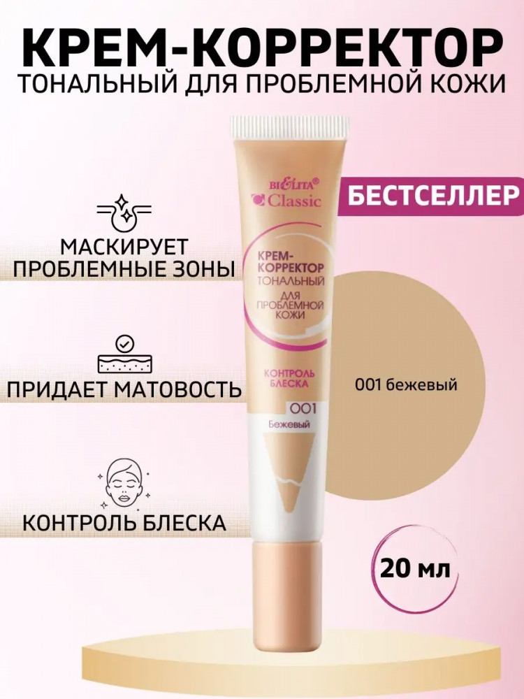 Bielita Крем-корректор тональный для проблемной кожи лица «Контроль блеска», оттенок 001 Бежевый