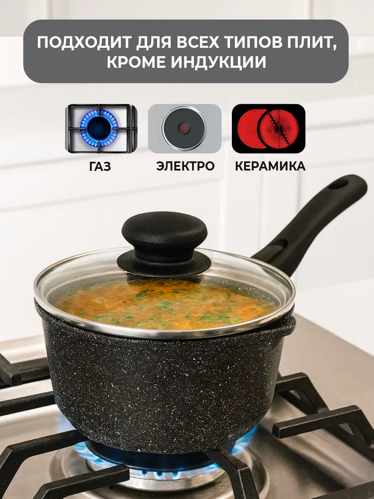 Антипригарное покрытие исключает пригорание продуктов, облегчая процесс приготовления и уход за посудой. Стеклянная крышка ковша не только добавляет эстетичности изделию, но и выполняет практическую функцию. Она позволяет контролировать процесс приготовления без необходимости её снятия, сохраняя тепло и аромат блюд. Съемная ручка обеспечивает компактность хранения. Удобный носик делает ковш кухонный с крышкой идеальным для аккуратного разлива жидкостей без риска проливания. Этот ковш с крышкой подходит для использования на всех типах плит, кроме индукционных. Это делает его универсальным решением для большинства современных кухонь. Будь то газовая или электрическая плита, вы всегда сможете насладиться удобством и функциональностью этого замечательного изделия.