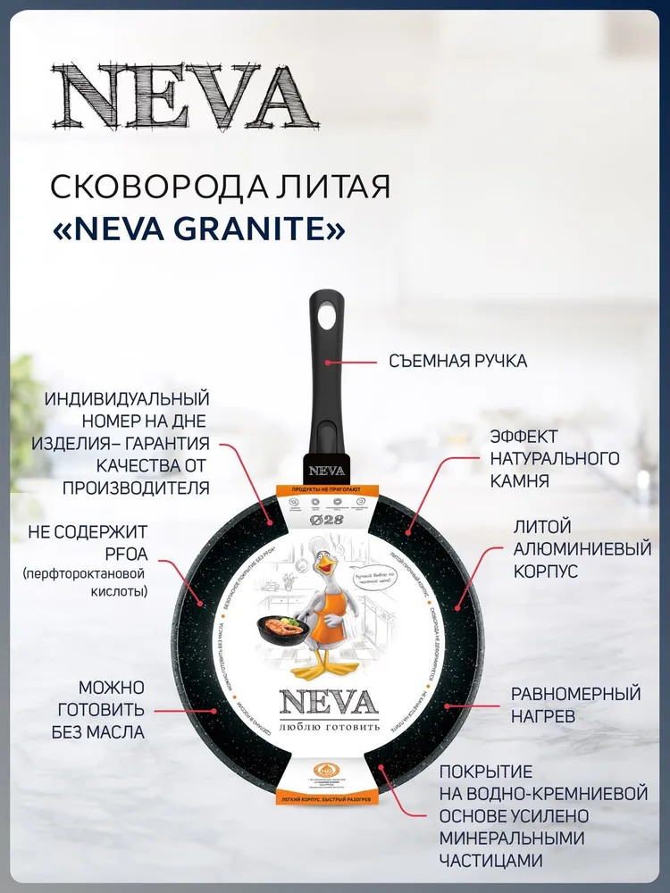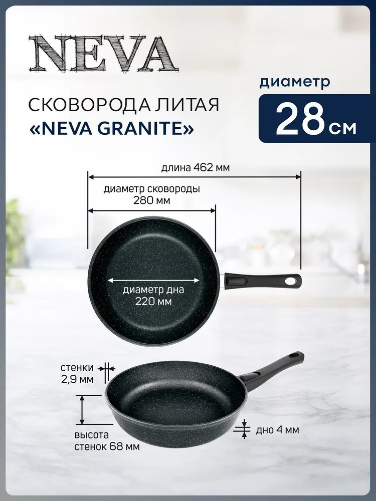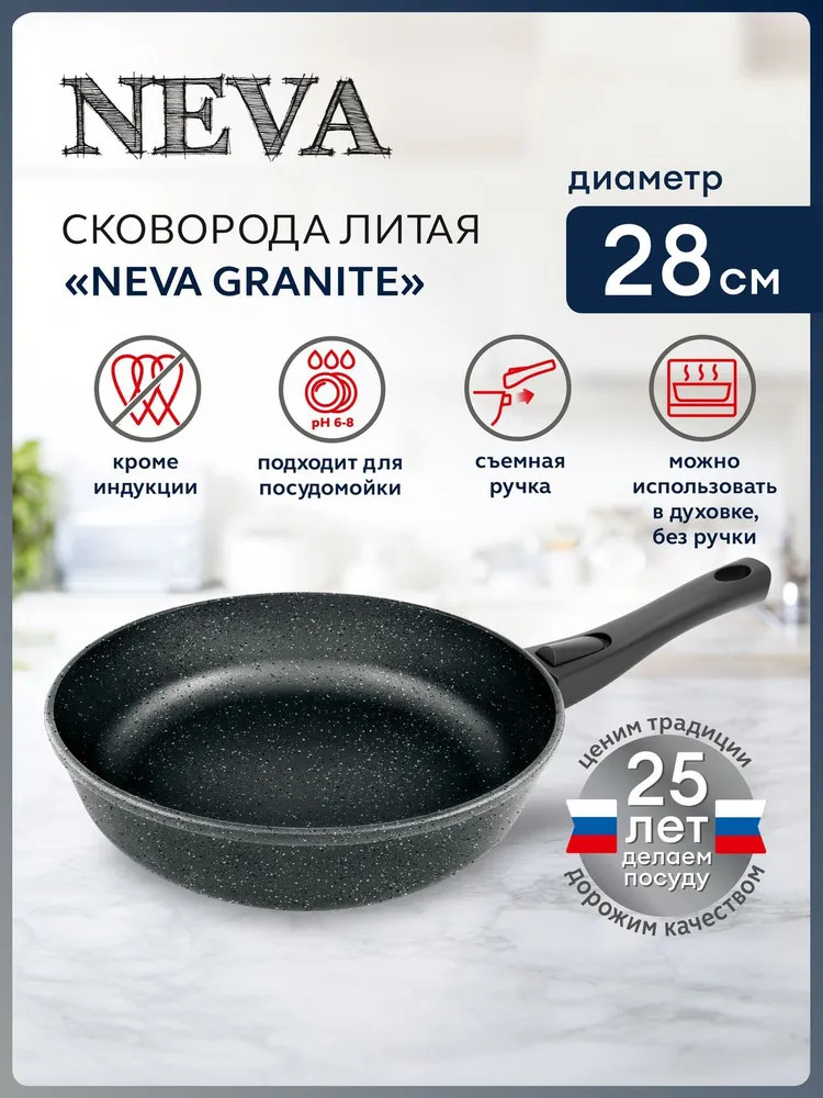 Классическая сковорода серии «Neva Granite» со съемной ручкой — черный цвет и трендовое покрытие под «камень» из литого алюминия с высокими бортами — безупречно подходит для ежедневного использования. Сняв ручку, сковороду можно использовать в духовке как форму для запекания. 3-слойное высококачественное антипригарное покрытие позволяет готовить без масла или с минимальным его количеством, сохраняя натуральный вкус продуктов. Антипригарные свойства не теряются даже при внешних механических повреждениях.