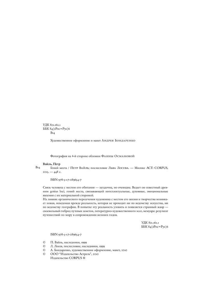 В данный момент этот товар отсутствует в продаже. Возможно, у нас найдется аналогичный или похожий товар здесь. Связь человека с местом его обитания - загадочна, но очевидна. Ведает ею известный древним genius loci, гений места, связывающий интеллектуальные, духовные, эмоциональные явления с их материальной средой.