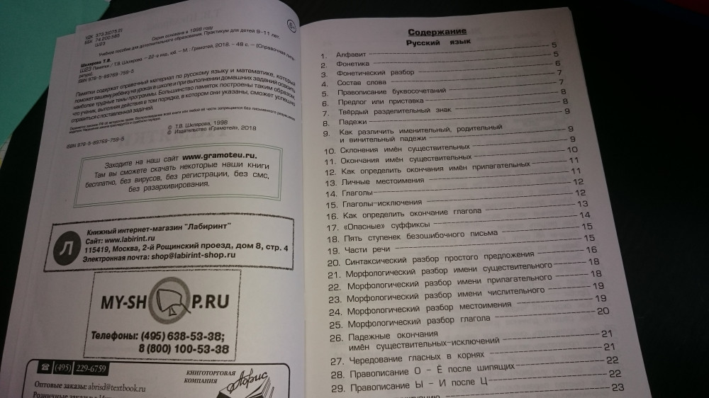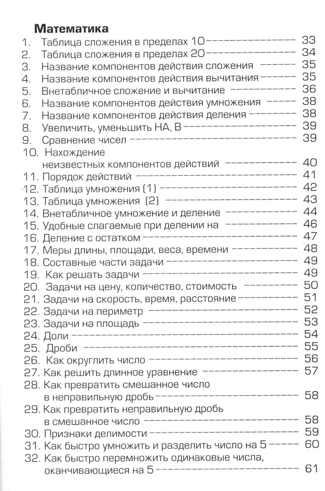 Тонкая обложка, 60 страниц из не просвечивающейся плотной бумаги, шрифт разный, но в основном крупный, местами просто огромный. Полезной информации вместилось в этой книжечке оооочень много. Содержаеие РУССКИЙ ЯЗЫК: Алфавит. Фонетический разбор. Состав слова. Правописание буквосочетаний. Предлог или приставка. Твёрдый разделительный знак. Падежи. Склонение имён существительных. Окончание имён существительных. Как определить окончания имён прилагательных. Личные местоимения. Глаголы. Глаголы-исключения. Как определить окончания глагола. Опасные суффиксы. 5 ступенек безошибочного письма. Части речи. Падежные окончания имён существительных-исключений. Синтаксический разбор простого предложения. Морфологический разбор имени существительного. Морфологический разбор имени прилагательного. Морфологический разбор имени числительного. Морфологический разбор местоимения. Морфологический разбор глагола. Правописание О-Ё после шипящих. Правописание Ы-И после Ц. Чередование гласных в корнях. Проверь пунктуацию. МАТЕМАТИКА: Таблица сложения в пределах 10 и 20 Названия компонентов действия сложения. Названия компонентов действия вычитания. Внетабличное сложение и вычитание. Названия компонентов действия умножения. Названия компонентов действия деления. Увеличить, уменьшить НА, В.. Сравнение чисел. Нахождение неизвестных компонентов действий. Порядок действий. Таблица умножения 2 дополнительных вида. Внетабличное умножение и деление. Удобные слагаемые при делении на.. Деление с остатком. Меры длины, площади,веса, времени.. Составные части задачи. Как решать задачи. Задачи на цену, количество, стоимость. Задачи на скорость, время, расстояние. Задачи на периметр. Задачи на площадь. Доли. Дроби. Как округлить число. Как решить длинное уравнение. Как превратить смешанное число в неправильную дробь. как превратить неправильную дробь в смешанное число. Признаки делимости. Как быстро умножить и разделить число на 5 Как быстро перемножить одинаковые числа, оканчивающиеся на 5