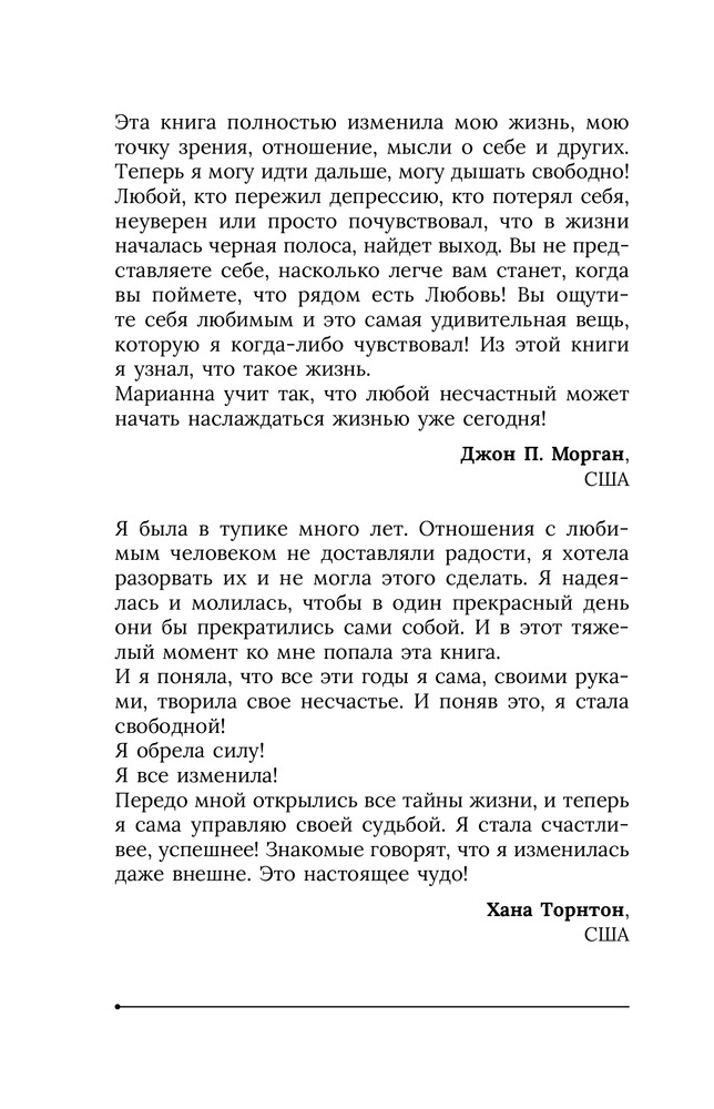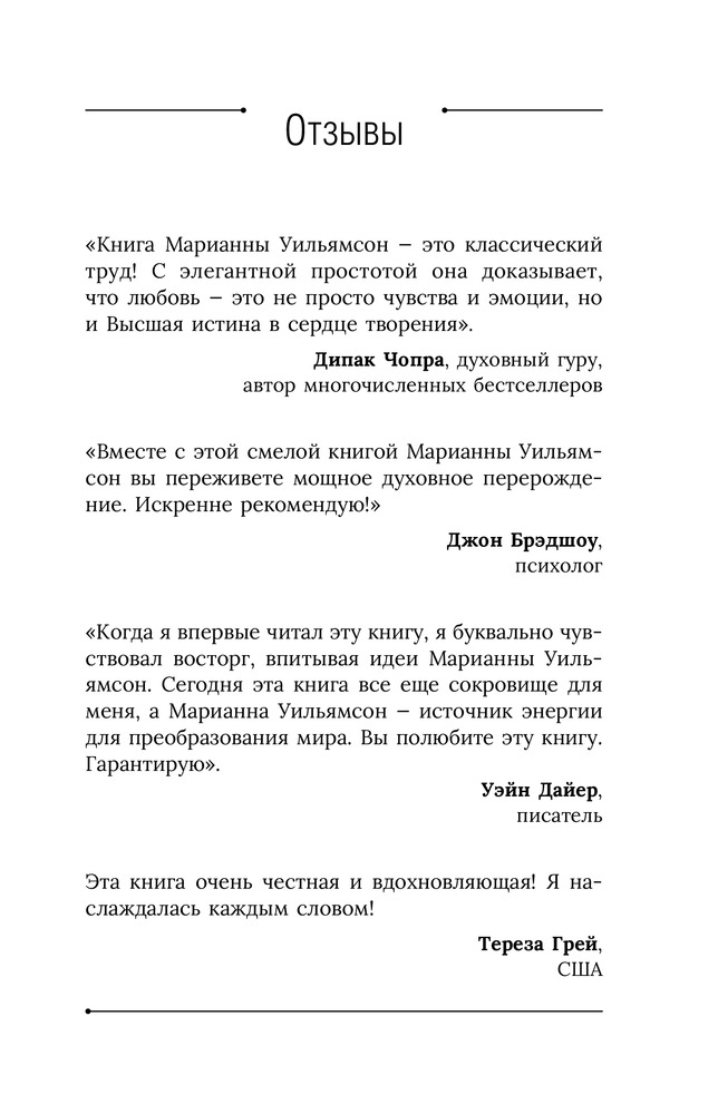 Пройдите этот путь вместе с Марианной Уильямсон — в прошлом неудачницей, одиночкой, разочаровавшейся в любви, друзьях, жизни, а в настоящем — одной из самых успешных женщин-писательниц Америки и (что гораздо важнее!) любимой, любящей, счастливой! А произошло с ней то самое «обыкновенное чудо» — в ее жизнь вошла Любовь.