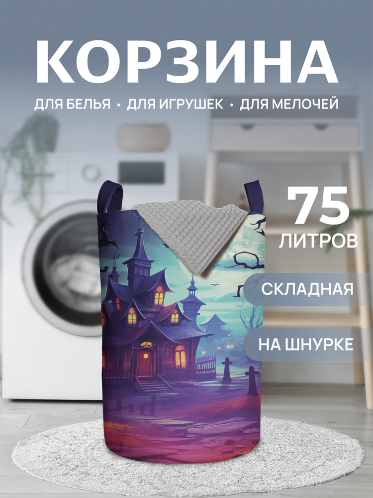 Крепкие ручки и легкость материала позволяют использовать контейнер не только под грязное белье, но и для хранения игрушек, сумок, обуви и других аксессуаров. Верхняя часть закрывается текстильной вставкой с завязками, как крышка, что позволяет скрыть содержимое изделия. Напольный круглый мешок занимает минимальное количество места, легко перемещается при уборке и не царапает пол, в отличие от пластикового ящика.