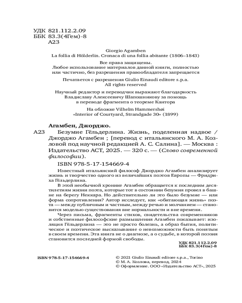 💳 Оплатить за товар можно при получении 🇰🇿 Есть бесплатная доставка по Казахстану от 1 дня 🎁 Копите бонусы с каждой покупки Серия: Слово современной философии (Лёд) Известный итальянский философ Джорджо Агамбен анализирует жизнь и творчество одного из величайших поэтов Европы — Фридриха Гёльдерлина. В этой необычной хронике Агамбен обращается к последним десятилетиям жизни поэта, которые тот в состоянии безумия провел в башне на берегу Неккара. Но действительно ли это было безумие — или форма сопротивления? Автор исследует, как «обитающая жизнь» поэта — между публичным и частным, между речью и молчанием — становится моделью существования вне нормальности и вне времени. |