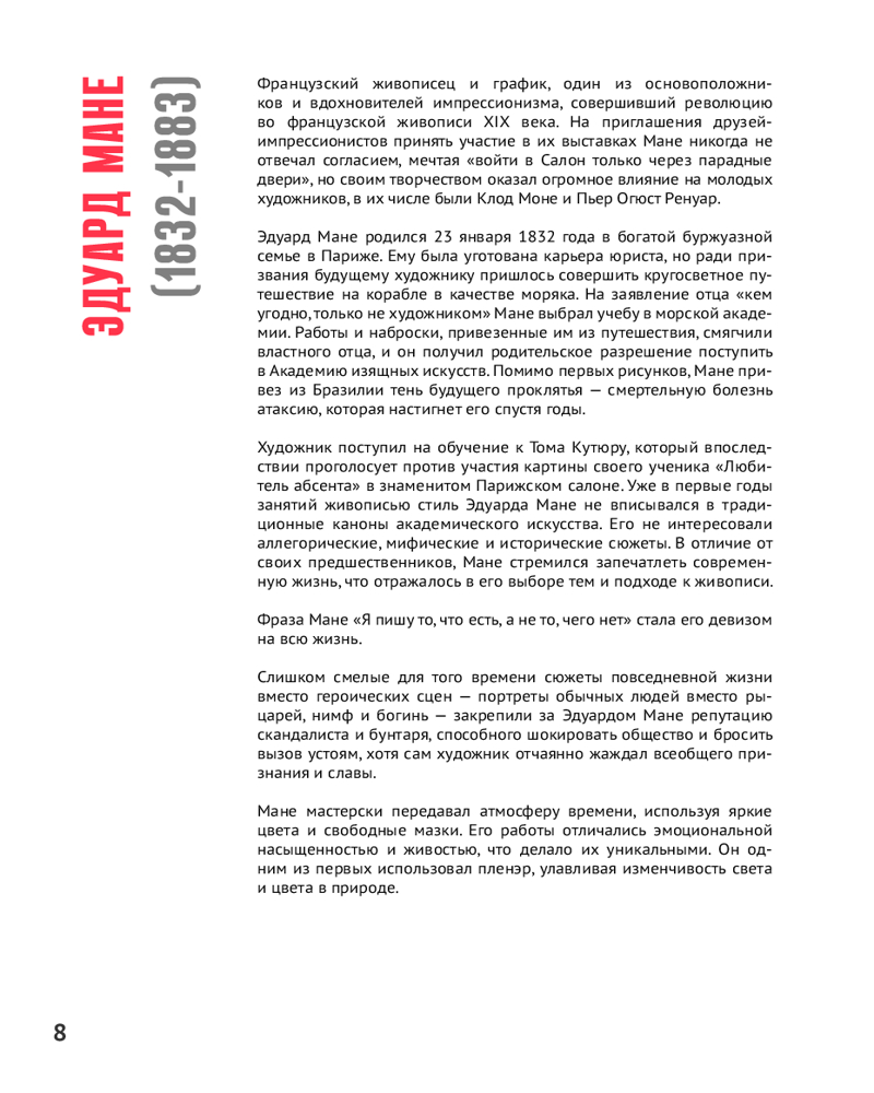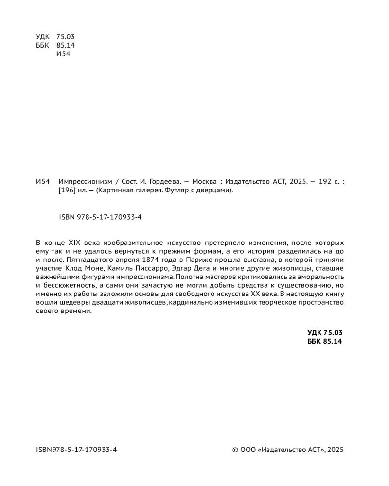 Серия: Картинная галерея. Футляр с дверцами В конце XIX века изобразительное искусство претерпело изменения, после которых ему так и не удалось вернуться к прежним формам, а его история разделилась на до и после. Пятнадцатого апреля 1874 года в Париже прошла выставка, в которой приняли участие Клод Моне, Камиль Писсарро, Эдгар Дега и многие другие живописцы, ставшие важнейшими фигурами импрессионизма. Полотна мастеров критиковались за аморальность и бессюжетность, а сами они зачастую не могли добыть средства к существованию, но именно их работы заложили основы для свободного искусства XX века. В настоящую книгу вошли шедевры двадцати живописцев, кардинально изменивших творческое пространство своего времени. |