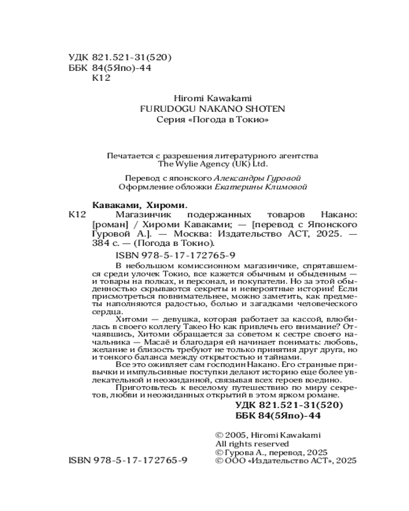 💳 Оплатить за товар можно при получении 🇰🇿 Есть бесплатная доставка по Казахстану от 1 дня 🎁 Копите бонусы с каждой покупки Серия: Погода в Токио В небольшом комиссионном магазинчике, спрятавшемся среди улочек Токио, все кажется обычным и обыденным — и товары на полках, и персонал, и покупатели. Но за этой обыденностью скрываются секреты и невероятные истории! Если присмотреться повнимательнее, можно заметить, как предметы наполняются радостью, болью и загадками человеческого сердца.Хитоми — девушка, которая работает за кассой, — влюбилась в своего коллегу Такео. Но как привлечь его внимание? Отчаявшись, Хитоми обращается за советом к сестре своего начальника — Масаё — и благодаря ей начинает понимать: любовь, желание и близость требуют не только принятия друг друга, но и тонкого баланса между открытостью и тайнами. Все это оживляет сам господин Накано. Его странные привычки и импульсивные поступки делают историю еще более увлекательной и неожиданной, связывая всех героев воедино. |