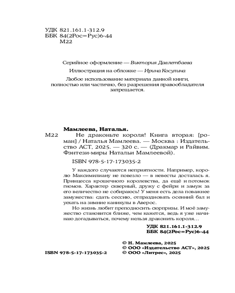 💳 Оплатить за товар можно при получении 🇰🇿 Есть бесплатная доставка по Казахстану от 1 дня 🎁 Копите бонусы с каждой покупки Серия: Фэнтези-миры Натальи Мамлеевой У каждого в жизни случаются неприятности. Например, королю Максимилиану не повезло — в невесты досталась я. Принцесса одного крошечного королевства, да еще потомок гномов. Характер скверный, дружу с фейри и замуж за его величество не собираюсь! У меня есть дела поважнее замужества: сдать сессию, отпраздновать осенний бал и уехать на зимние каникулы в Аверос. Но жизнь любит преподносить сюрпризы. И мое замужество становится ближе, чем кажется, ведь я уже начинаю догадываться, почему нельзя драконить короля... |