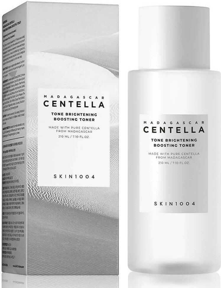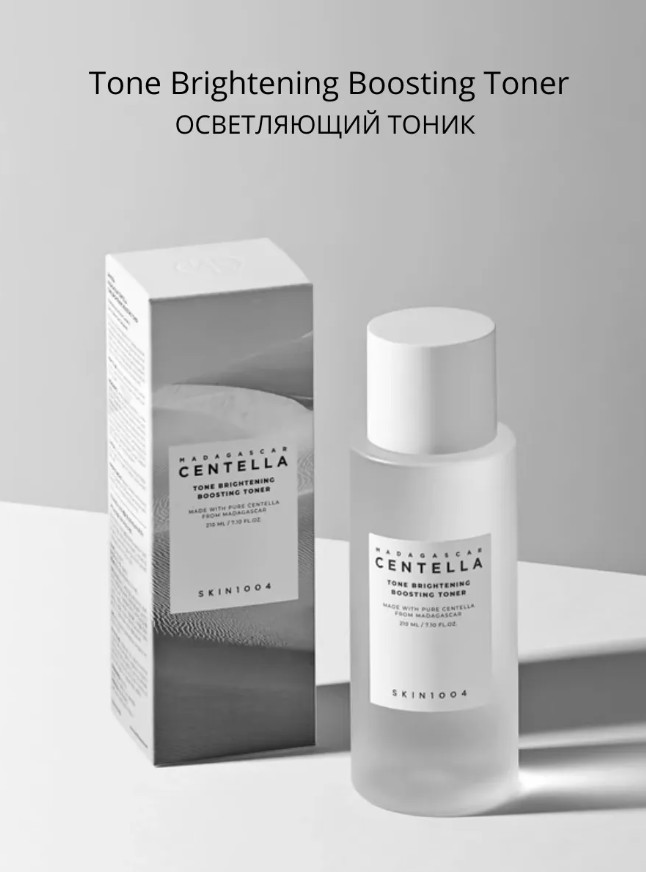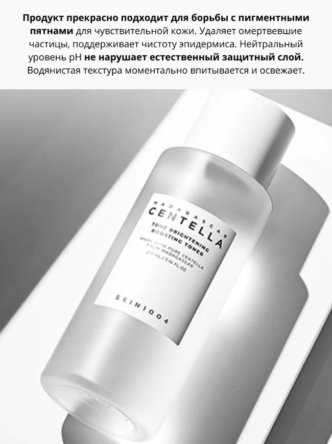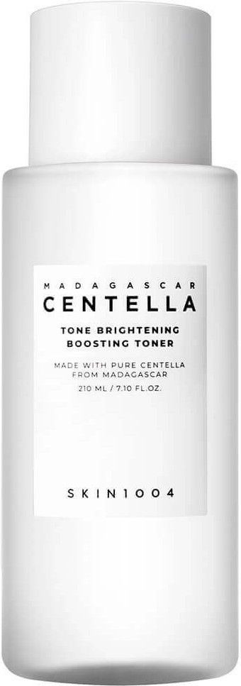 Skin1004 Madagascar Centella Tone Brightening Boosting Toner тонигі теріні тыныштандырып, ылғалдандырады, пигментацияны ағартып және тері түсін тегістей отырып, оны қабыршықтардан жұмсақ тазартады. Акнеден қалған іздердің көрінуін азайтады, терінің күнгірттігін жойып, тартылу сезімін тудырмай, сау жарқырау береді. Өнім сезімтал терідегі пигментті дақтармен күресуге өте қолайлы. Өлі жасушаларды кетіріп, эпидермистің тазалығын сақтайды. Бейтарап pH деңгейі табиғи қорғаныс қабатын бұзбайды. Су тәріздес құрылымы теріге лезде сіңіп, сергітеді.