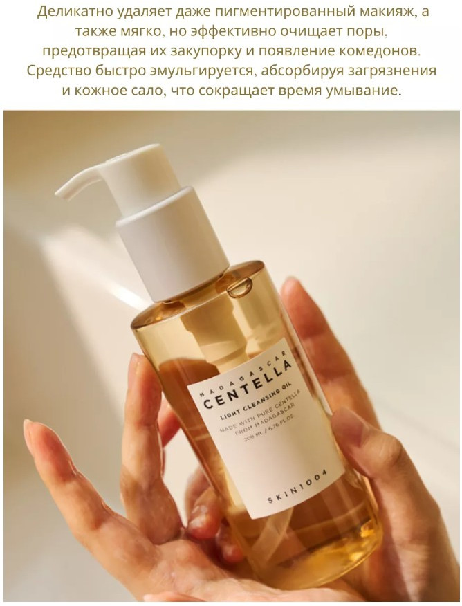 Гидрофильное масло SKIN1004 Madagascar Centella Light Cleansing Oil не только удаляет макияж и загрязнения, но также успокаивает и смягчает чувствительную кожу. Средство деликатно удаляет стойкий макияж, эффективно очищает поры и препятствует их закупориванию, удаляя загрязнения, излишки себума и ороговевшие частицы. Масло быстро эмульгируется, абсорбируя себум, что сокращает время умывания. Продукт создаёт на коже неощутимый влагоудерживающий барьер, который предотвращает сухость и ощущение стянутости после умывания.