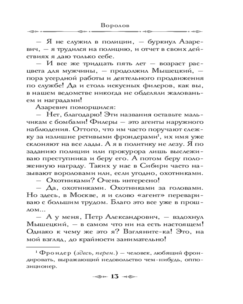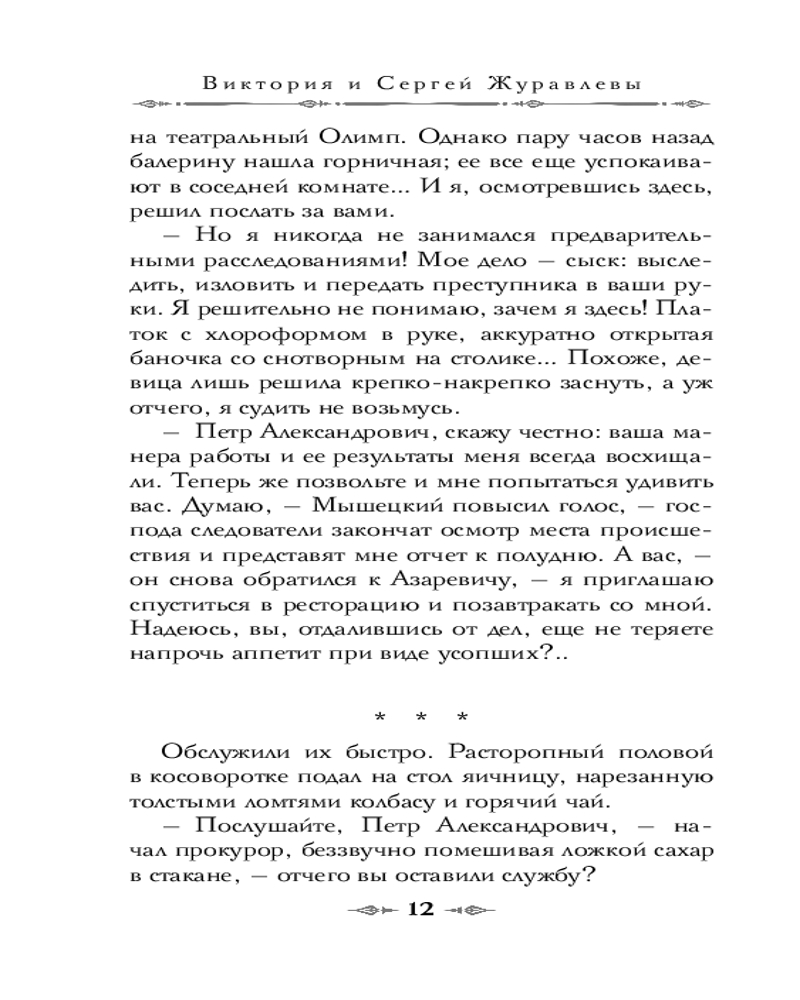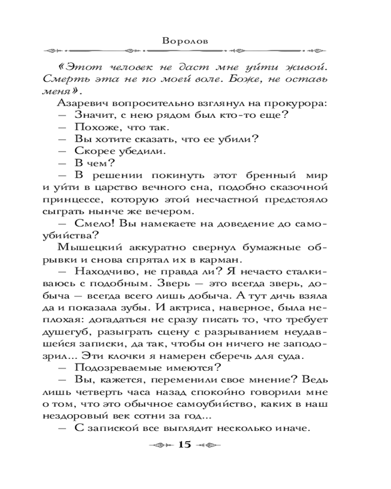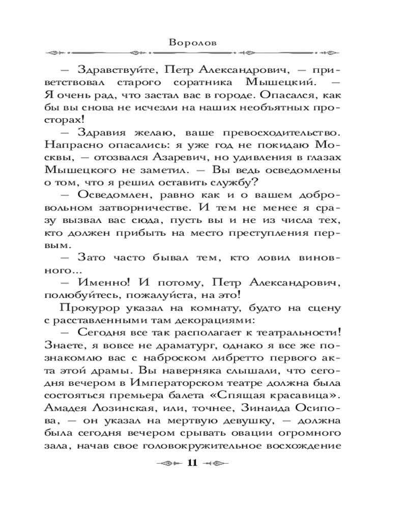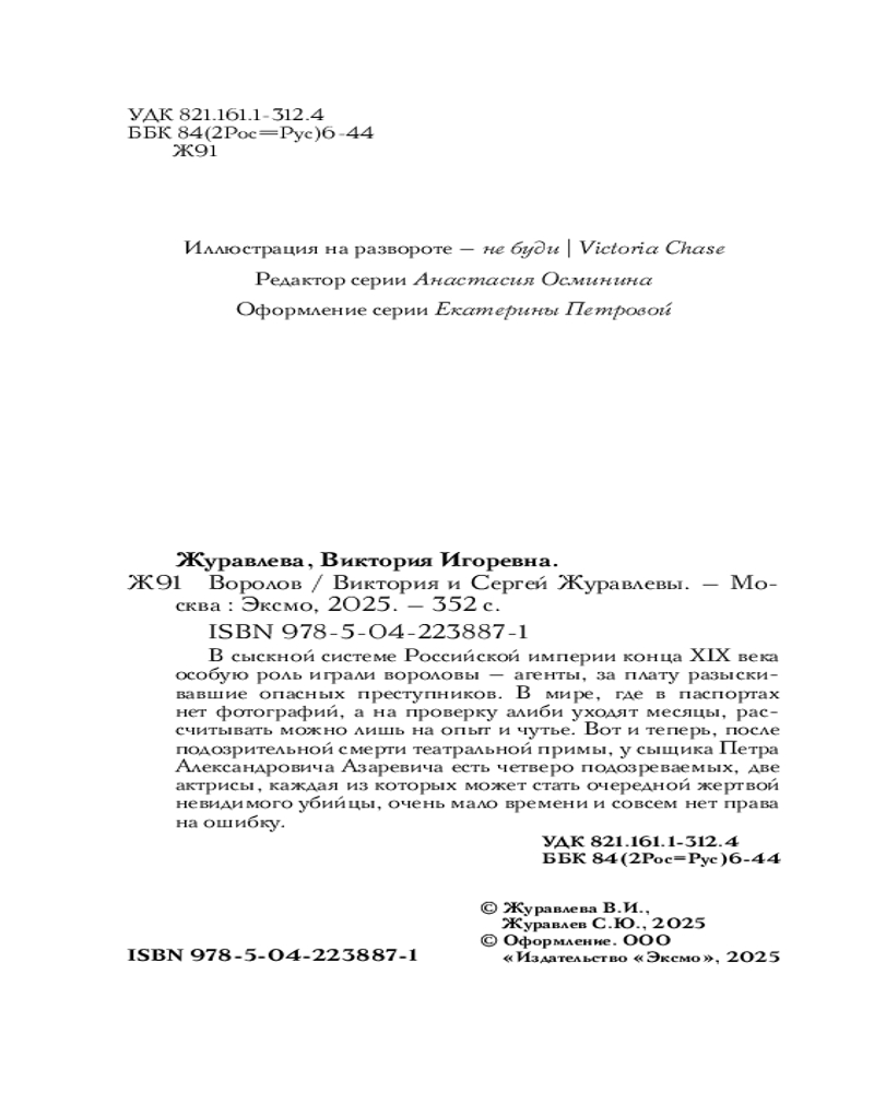 Серия: Губернский детектив. Расследования Воролова Новое громкое дело в Москве XIX века! В сыскной системе Российской империи конца XIX века особую роль играли вороловы — агенты, за плату разыскивавшие опасных преступников. В мире, где в паспортах нет фотографий, а на проверку алиби уходят месяцы, рассчитывать можно лишь на опыт и чутье. Вот и теперь, после подозрительной смерти театральной примы, у сыщика Петра Александровича Азаревича есть четверо подозреваемых, две актрисы, каждая из которых может стать очередной жертвой невидимого убийцы, очень мало времени — и совсем нет права на ошибку. |