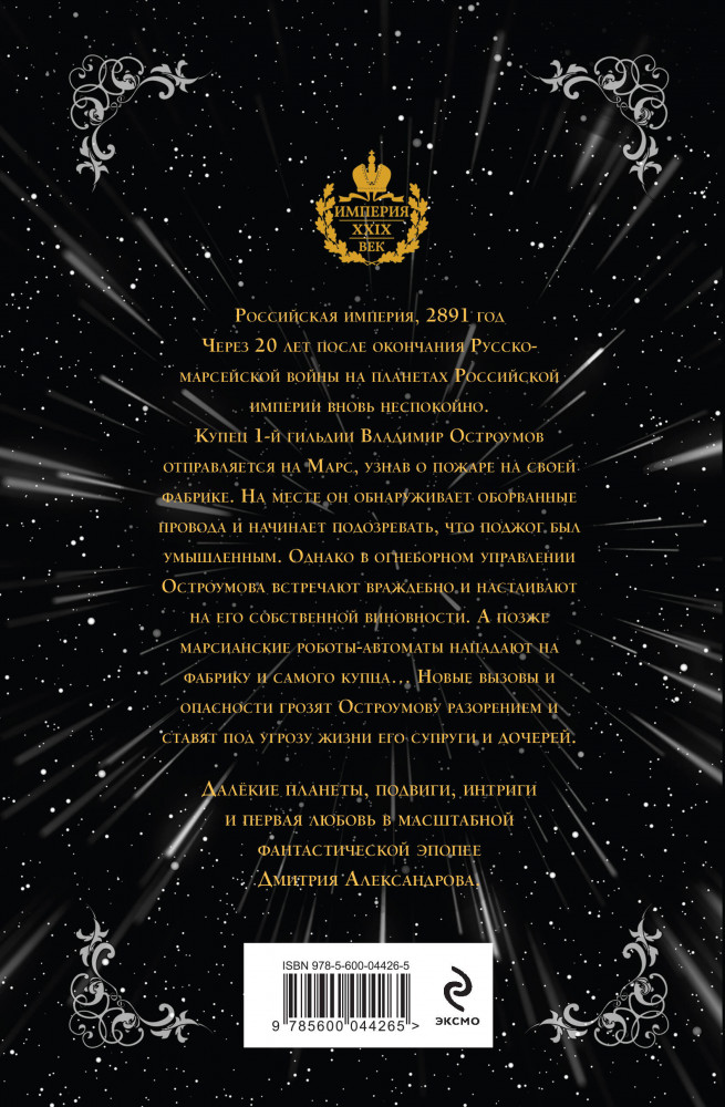Серия: Бюро магических расследований Российская Империя, 2891 год. Через 20 лет после окончания Русско-марсейской войны на планетах Российской империи вновь неспокойно. Купец 1-й гильдии Владимир Остроумов отправляется на Марс, узнав о пожаре на своей фабрике. На месте он обнаруживает оборванные провода и начинает подозревать, что поджог был умышленным. Однако в огнеборном управлении Остроумова встречают враждебно и настаивают на его собственной виновности. А позже марсианские роботы-автоматы нападают на фабрику и самого купца... Новые вызовы и опасности грозят Остроумову разорением и ставят под угрозу жизни его супруги и дочерей. |