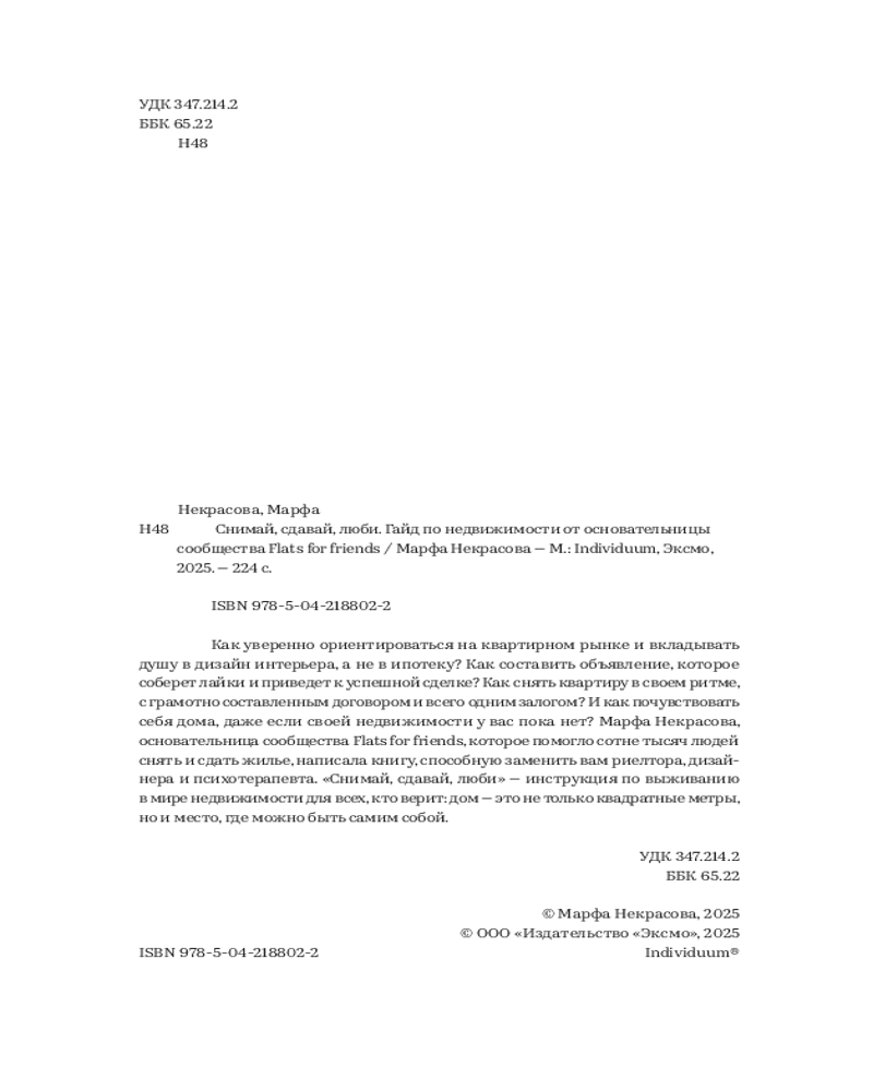 Как уверенно ориентироваться на квартирном рынке и вкладывать душу в дизайн интерьера, а не в ипотеку? Как составить объявление, которое соберет лайки и приведет к успешной сделке? Как снять квартиру в своем ритме, с грамотно составленным договором и всего одним залогом? И как почувствовать себя дома, даже если своей недвижимости у вас пока нет? Марфа Некрасова, основательница сообщества Flats for friends, которое помогло сотне тысяч людей снять и сдать жилье, написала книгу, способную заменить вам риелтора, дизайнера и психотерапевта. «Снимай, сдавай, люби» — инструкция по выживанию в мире недвижимости для всех, кто верит: дом — это не только квадратные метры, но и место, где можно быть самим собой. |